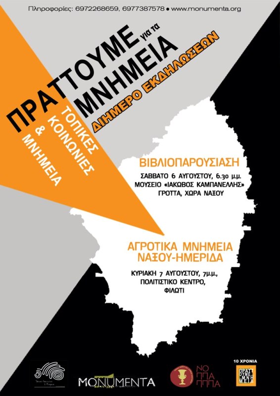 Η Αστική μη Κερδοσκοπική Εταιρεία για την προστασία της φυσικής και αρχιτεκτονικής κληρονομιάς Ελλάδας και Κύπρου MONUMENTA και το Νομικό Πρόσωπο Πολιτισμού, Αθλητισμού, Περιβάλλοντος, Παιδείας, Πρόνοιας και Αλληλεγγύης Δήμου Νάξου και Μικρών Κυκλάδων (ΝΟΠΠΑΠΠΠΑ) διοργανώνουν διήμερο εκδηλώσεων για τα μνημεία της Νάξου.
