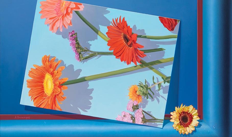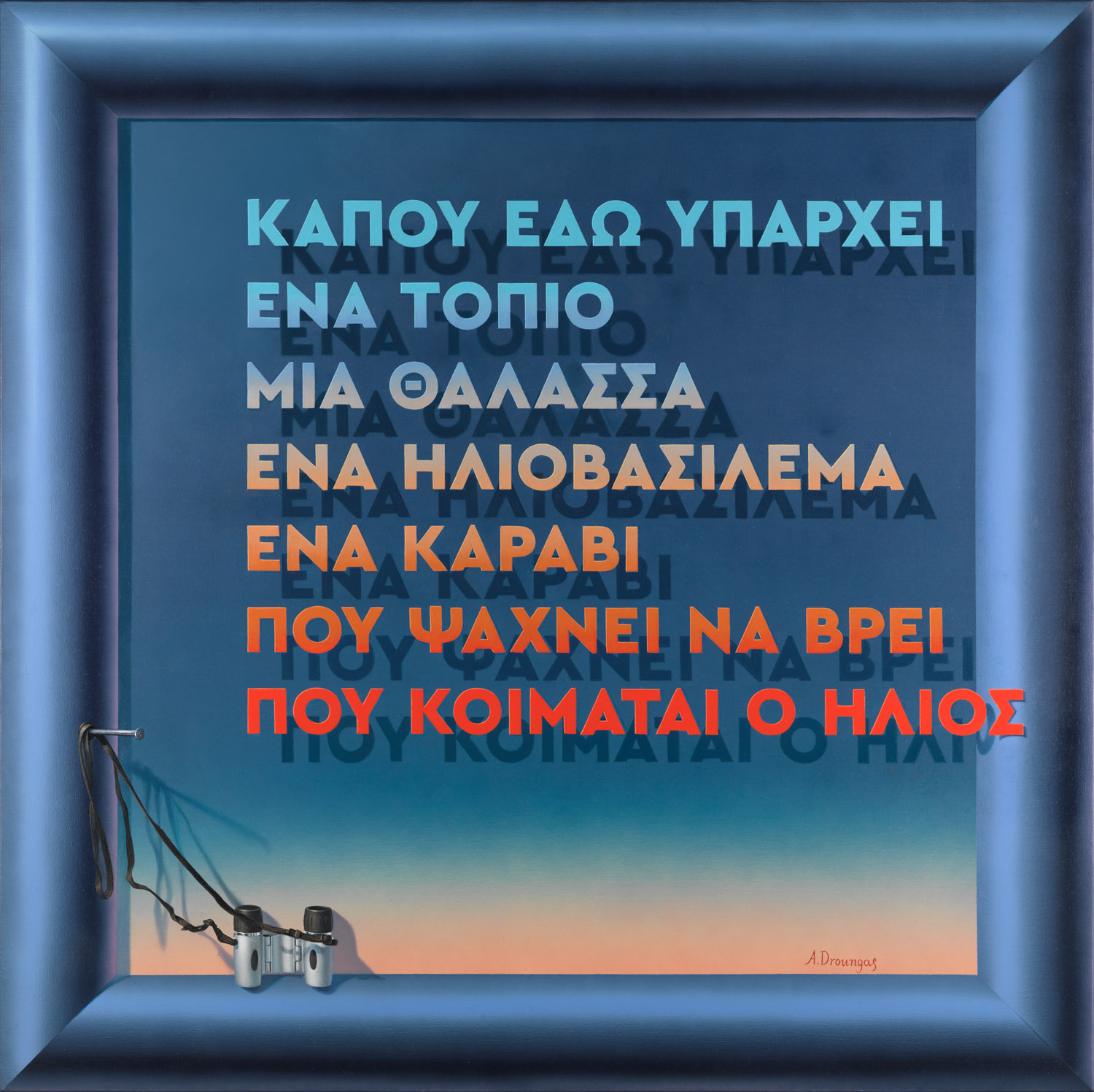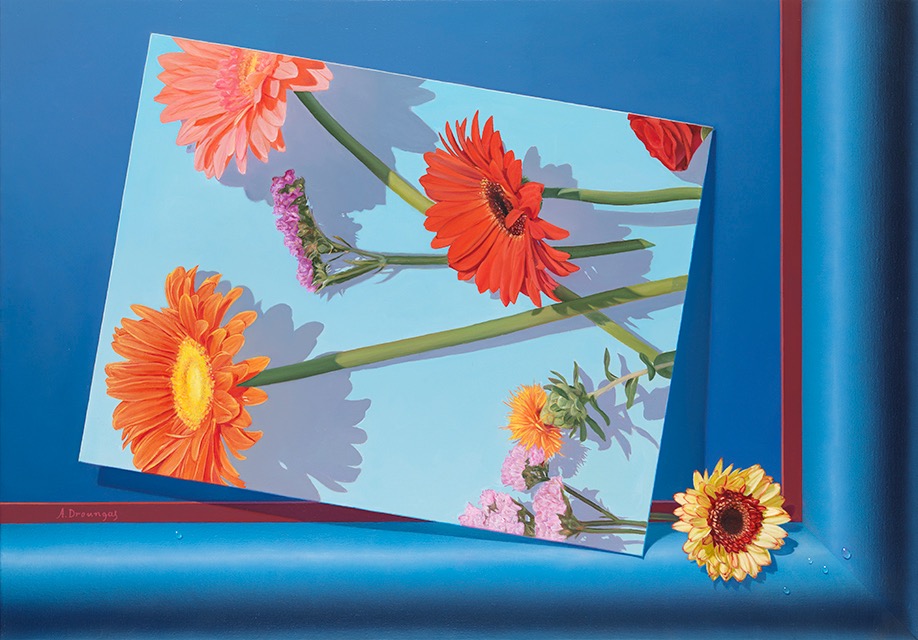 Από την πλευρά του, ο Αχιλλέας Δρούγκας, αν και όχι Συριανός, ωστόσο γνωρίζει καλά το νησί, το οποίο έχει ζήσει και αγαπήσει. Σε διαφορετικό μήκος κύματος τα δικά του έργα, θυμίζουν τρισδιάστατες κατασκευές. Το φόντο είναι συνήθως παραλλαγή του ίδιου σκούρου μπλε και μπροστά σε αυτό στέκουν αντικείμενα ή ανθρώπινα μέλη που συντελούν στη δημιουργία μιας έννοιας ή είναι η πρόκληση, ή το αποτέλεσμα μιας ανθρώπινης πράξης. Ο ίδιος ο ζωγράφος ονομάζει αυτή τη σειρά "χειρονομίες".