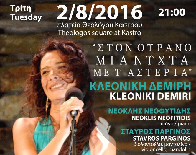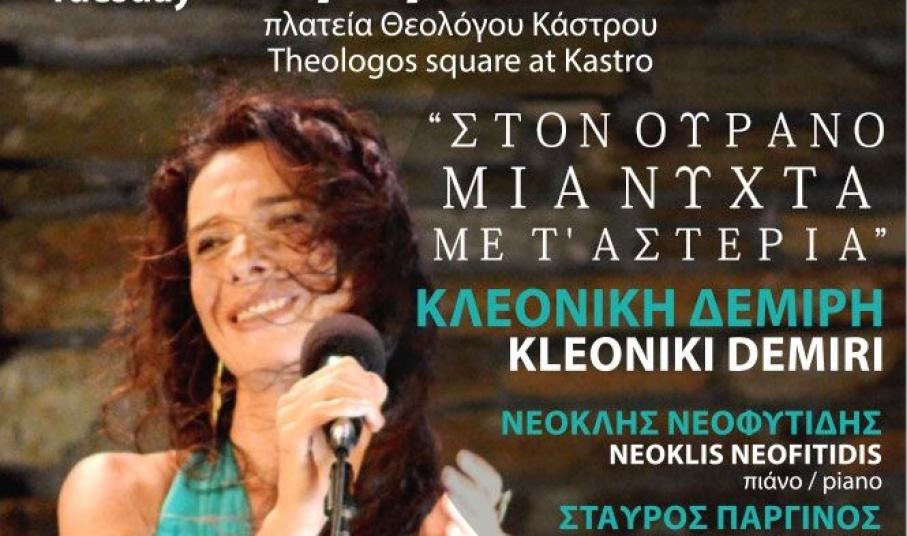 Η Κλεονίκη στο τραγούδι, ο Νεοκλής Νεοφυτίδης στο πιάνο και ο Σταύρος Παργινός στο βιολοντσέλο και στο μαντολίνο θα ταξιδέψουν το κοινό «Στον Ουρανό μια νύχτα με τα’ αστέρια».