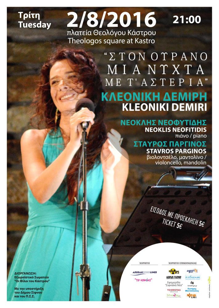Τη συναυλία διοργανώνει το Εξωραϊστικό Σωματείο «Οι Φίλοι του Κάστρου», με την υποστήριξη του Δήμου Σίφνου και του Πολιτιστικού Συλλόγου Σίφνου