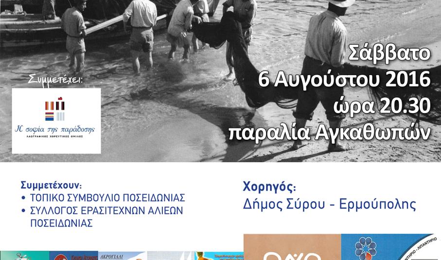 Ο Πολιτιστικός Σύλλογος Ποσειδωνίας «ο Ποσειδών» σε συνεργασία με το Δήμο Σύρου - Ερμούπολης, το Τοπικό Συμβούλιο Ποσειδωνίας και το Σύλλογο των ερασιτεχνών αλιέων της Ποσειδωνίας, σας προσκαλούν το Σάββατο 6 Αυγούστου 2016 και ώρα 20:30 στην παραλία των Αγκαθωπών, στην νησιώτικη εκδήλωση «Το τράβηγμα της πεζότρατας και το ψήσιμο της σαρδέλας».