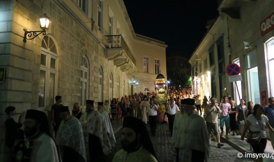 Ακολούθως, ετέθη επικεφαλής της πανδήμου λιτανείας της ιεράς Εικόνος της Μεταμορφώσεως, πλαισιουμένης από Προσκόπους, η οποία κατευθυνθηκε προς την Πλατεία Μιαούλη, όπου ανεπέμφθη Δέηση και ο Σεβασμιώτατος κ. Δωρόθεος Β' ομίλησε για τη θεολογική σημασία της Μεταμορφώσεως του Κυρίου και την πρόσκληση για την προσωπική του καθενός μεταμόρφωση, αναφέρθηκε στην ίδρυση της Ερμούπολης από τους πρόσφυγες των σφαγών στη Μικρά Ασία και τα νησιά του Ανατολικού Αιγαίου, κατά την Επανάσταση του 1821 και στον επικείμενο εορτασμό των 190 χρόνων από την ονοματοδοσία της νεοφύτου πόλεως και ευχαρίστησε τους επισκέπτες του νησιού, για την επιλογή τους να έλθουν στη Σύρο για τις διακοπές τους.