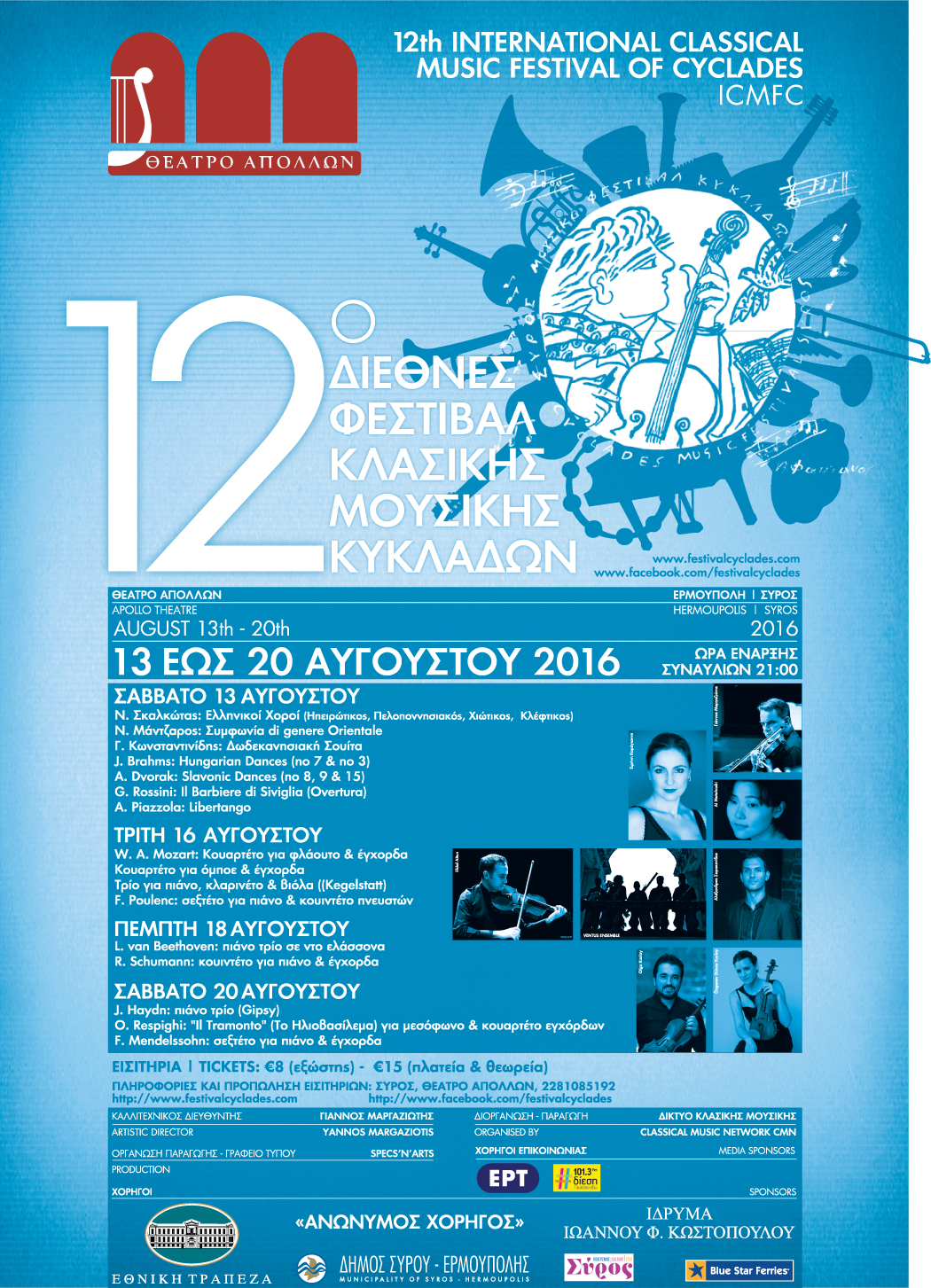 Στο πλαίσιο των πολιτιστικών εκδηλώσεων του Δήμου Σύρου – Ερμούπολης «Σύρος - Πολιτισμός 2016», θα πραγματοποιηθεί το 12ο Διεθνές Φεστιβάλ Κλασικής Μουσικής Κυκλάδων, από τις 13 έως τις 20 Αυγούστου 2016 και ώρα έναρξης 21:00, στο Θέατρο Απόλλων.