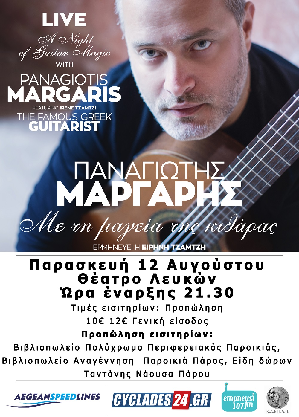 Ο κορυφαίος Έλληνας κιθαρίστας Παναγιώτης Μάργαρης έχοντας στο ενεργητικό του 14 προσωπικούς δίσκους, πολλά μουσικά βραβεία και περισσότερες από 1500 συναυλίες, θα μας ταξιδέψει στους μαγικούς ήχους της κλασικής κιθάρας.