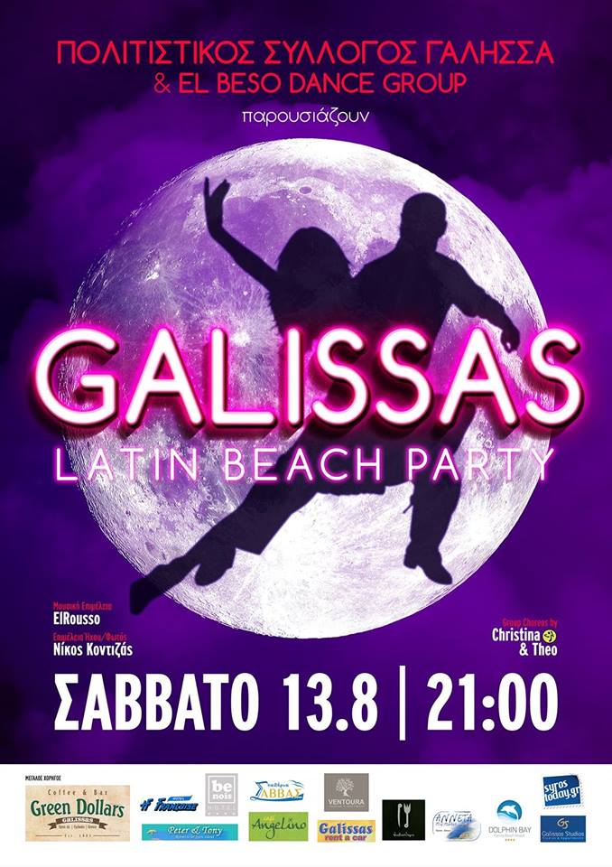 Στο πλαίσιο των εκδηλώσεων του Δήμου Σύρου – Ερμούπολης «Σύρος – Πολιτισμός 2016», ο Πολιτιστικός Σύλλογος Γαλησσά και το El Beso Dance Group θα πραγματοποιήσουν, το Σάββατο 13 Αυγούστου 2016 και ώρα 21:00, στον Γαλησσά, Latin Beach Party.