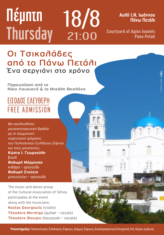 Η εκδήλωση «Οι Τσικαλάδες από το Πάνω Πετάλι» θα πραγματοποιηθεί την Πέμπτη 18 Αυγούστου στην Αυλή του Ιερού Ναού του Αγίου Ιωάννη στο Πάνω Πετάλι.