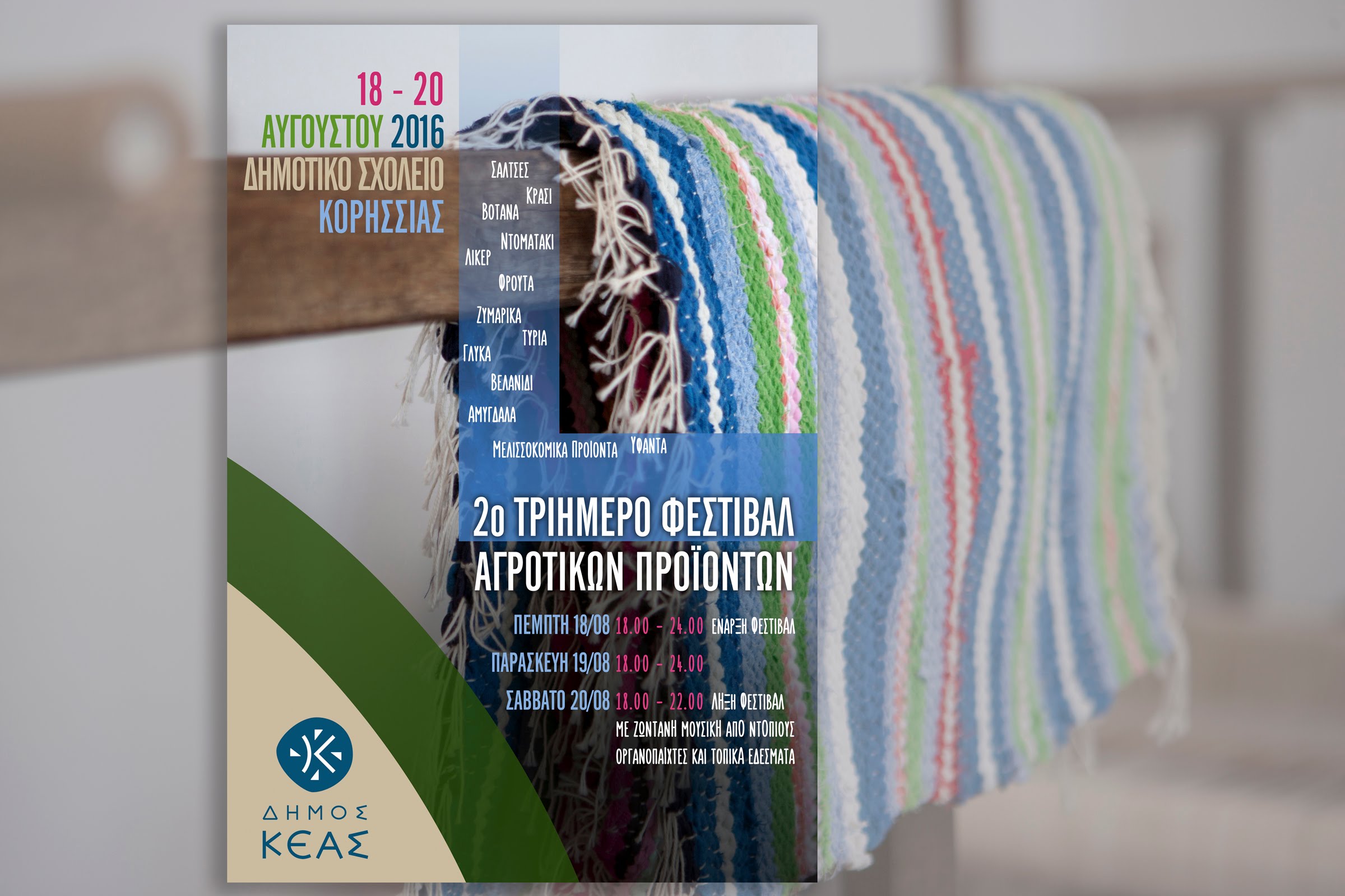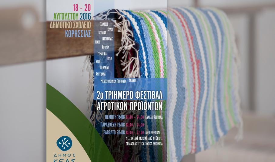 Το 2ο Τριήμερο Φεστιβάλ Αγροτικών Προϊόντων, μεγάλου γαστριμαργικού και πολιτιστικού ενδιαφέροντος, θα πραγματοποιηθεί στις 18, 19 και 20 Αυγούστου στο προαύλιο του Δημοτικού Σχολείου Κορησσίας.