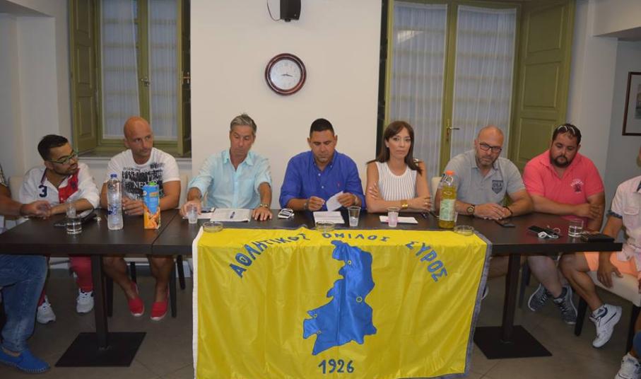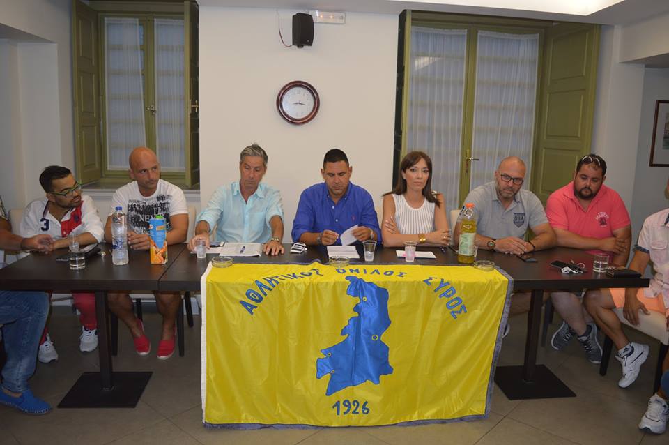 Τους φετινούς στόχους του Α.Ο. Σύρου ανέλυσε η διοίκηση και το τεχνικό επιτελείο του Α.Ο. Σύρου σε συνέντευξη Τύπου που παραχωρήθηκε την Πέμπτη το βράδυ σε γνωστό ξενοδοχείο του νησιού. Στο πάνελ κάθισε η διοίκηση με τους δύο προπονητές, Γιώργο Ρούσσο και Μάκη Βαρθαλίτη. Το παρών στην συνέντευξη Τύπου που έδωσε η διοίκηση του Α.Ο. Σύρου έδωσε ο δήμαρχος Σύρου – Ερμούπολης Γιώργος Μαραγκός, ο πρόεδρος της Ένωσης Ποδοσφαιρικών Σωματείων Κυκλάδων και η Περιφερειακή Σύμβουλος Νοτίου Αιγαίου Χριστιάννα Πάπιτση.