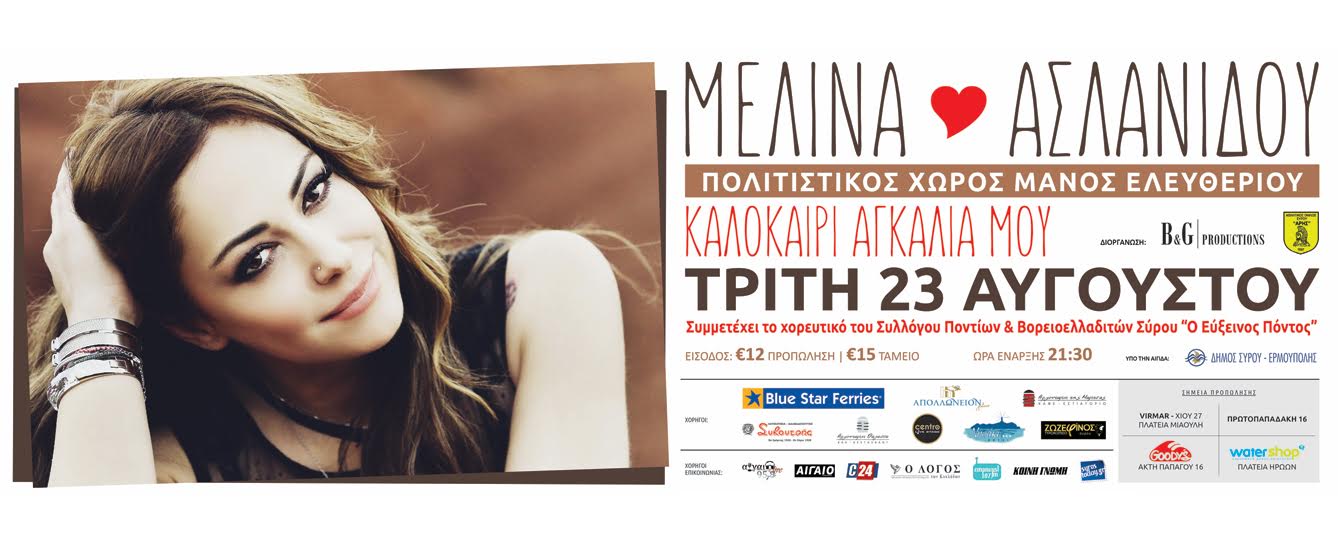 Στο πλαίσιο των πολιτιστικών εκδηλώσεων του Δήμου Σύρου – Ερμούπολης «Σύρος – Πολιτισμός 2016», θα πραγματοποιηθεί συναυλία της Μελίνας Ασλανίδου, τη Τρίτη 23 Αυγούστου 2016 και ώρα 21:30, στο Πολιτιστικό Χώρο «Μάνος Ελευθερίου» στην Ερμούπολη.