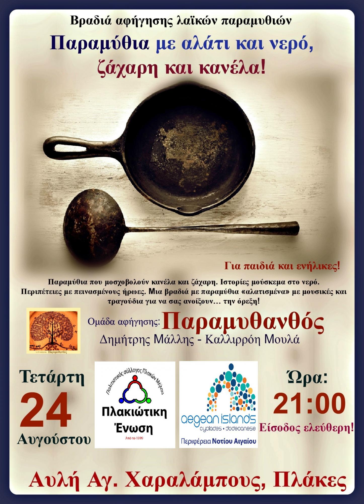 Παραμύθια που μοσχοβολούν κανέλα και ζάχαρη θα αφηγηθούν την Τετάρτη το βράδυ στις 21:00 στην αυλή του Αγίου Χαραλάμπους στις Πλάκες ο Δημήτρης Μάλλης και η Καλλιρρόη Μουλά.