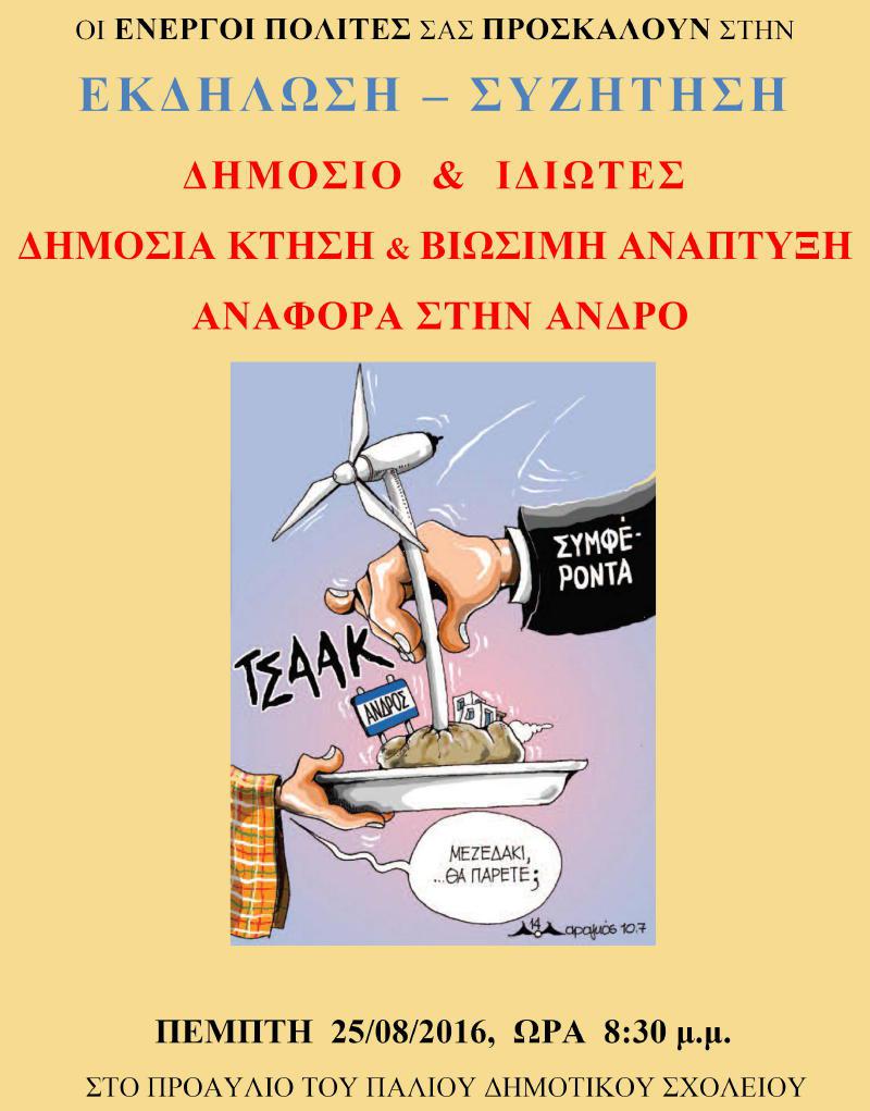 Εκδήλωση – συζήτηση με θέμα «Δημόσιο και Ιδιώτες –Δημόσια κτήση και βιώσιμη ανάπτυξη – Αναφορά στην Άνδρο», διοργανώνεται την Πέμπτη, 25 Αυγούστου 2016, στις 8:30 το βράδυ, στο προαύλιο του παλαιού Δημοτικού Σχολείου Γαυρίου.