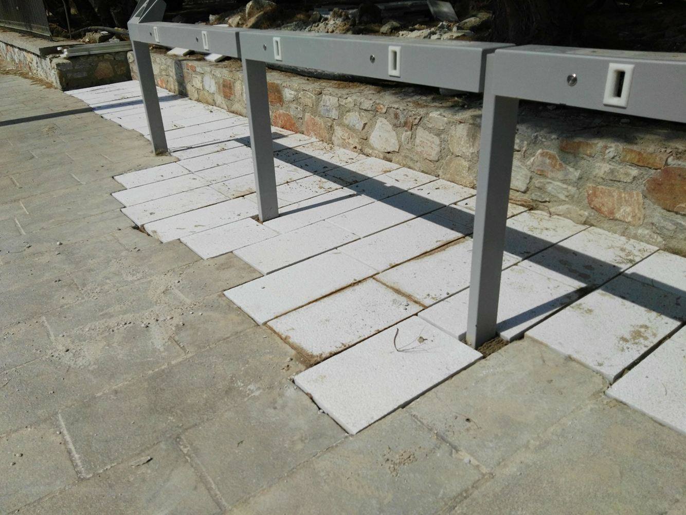 “Παραφωνία” αποτελεί εν μέρει το χρώμα των καινούργιων πλακών, το οποίο μοιραία δημιουργεί έντονη αντίθεση αν συγκριθεί με τις ήδη υφιστάμενες.