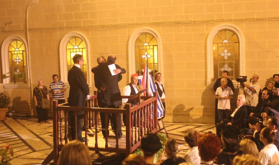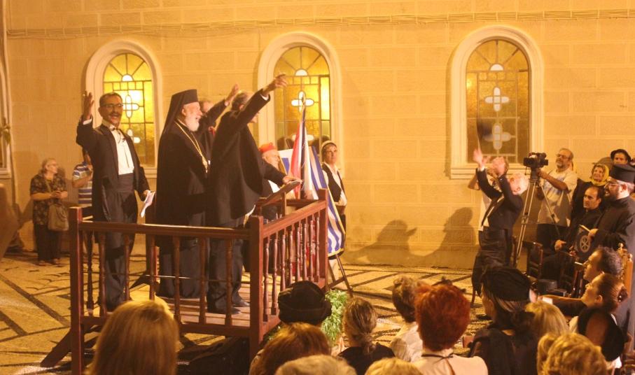 Στη συνέχεια, στο προαύλιο του Ναού παρουσιάστηκε αναπαράσταση των γεγονότων της 24ης Ιουνίου 1826, για τη συγκρότηση Δημογεροντίας και την ονομασία της νέας πόλεως, στην οποία συμμετείχε και ο Σεβασμιώτατος κ. Δωρόθεος Β’, διαβάζοντας την ομιλία του τότε Επισκόπου Μυρίνης Σωφρονίου, τοποτηρητή Άνδρου, που εποίμαινε και τη Σύρο.