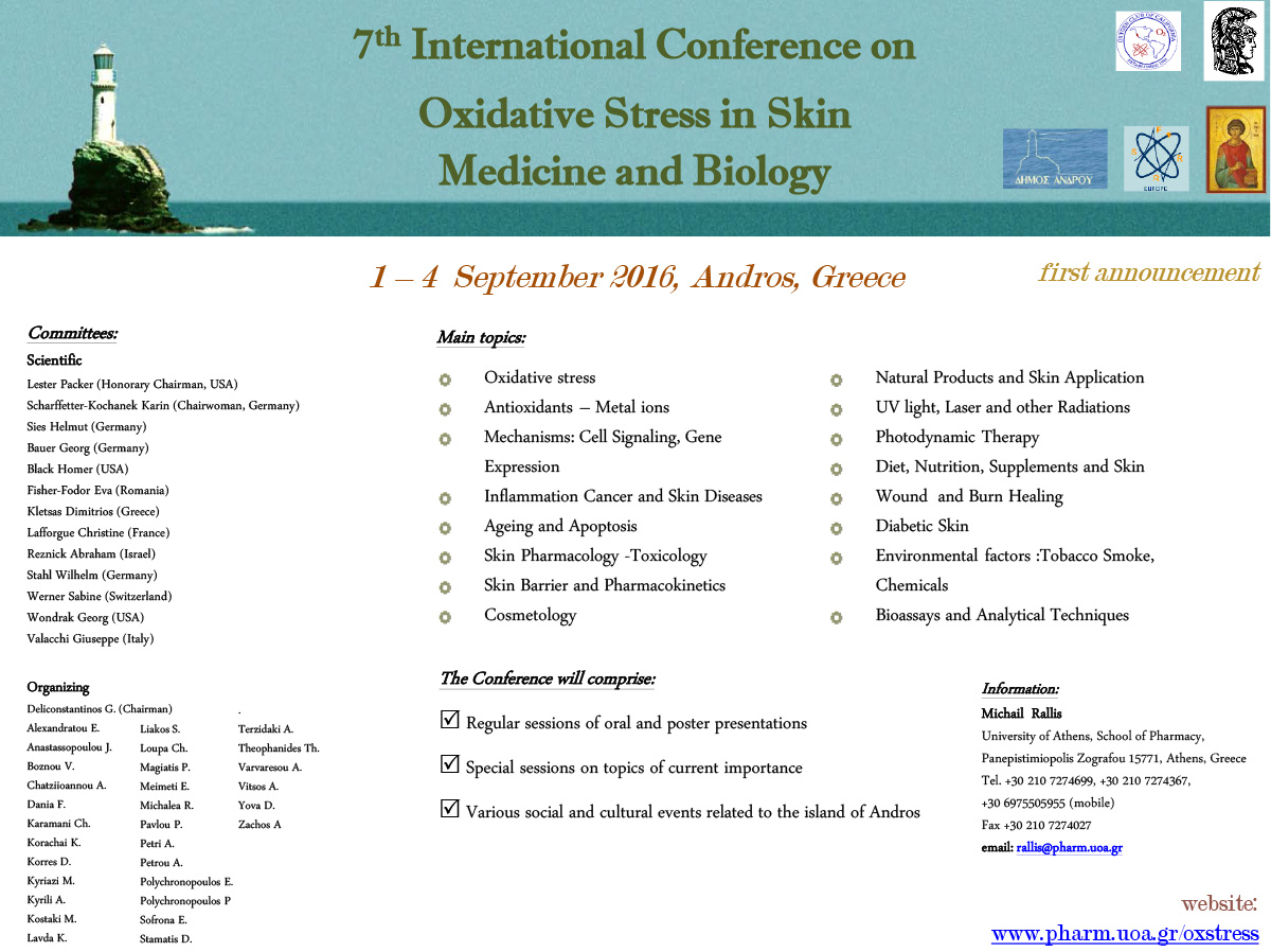 Στο πλαίσιο αυτό, ο Δήμος Άνδρου προσκαλεί επιστήμονες των τομέων υγείας, βιολογίας και χημείας που ζουν, εργάζονται ή απλά βρίσκονται ως επισκέπτες στην Άνδρο αυτή την εποχή, καθώς και τους φοιτητές των αντίστοιχων τμημάτων, να παρακολουθήσουν τις εργασίες του συνεδρίου. Λεπτομέρειες για το συνέδριο, μπορούν να πληροφορηθούν οι ενδιαφερόμενοι στην ακόλουθη ηλεκτρονική διεύθυνση: http://oxstress.pharm.uoa.gr.