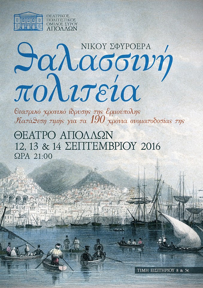 - Παρουσίαση του θεατρικού ιστορικού έργου «Θαλασσινή Πολιτεία» του Νίκου Σφυρόερα, από τη Δευτέρα 12 έως και την Τετάρτη 14 Σεπτεμβρίου 2016 και ώρα 21:00, στο Θέατρο Απόλλων.