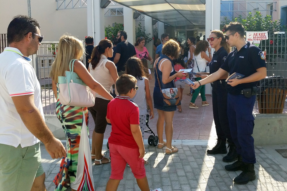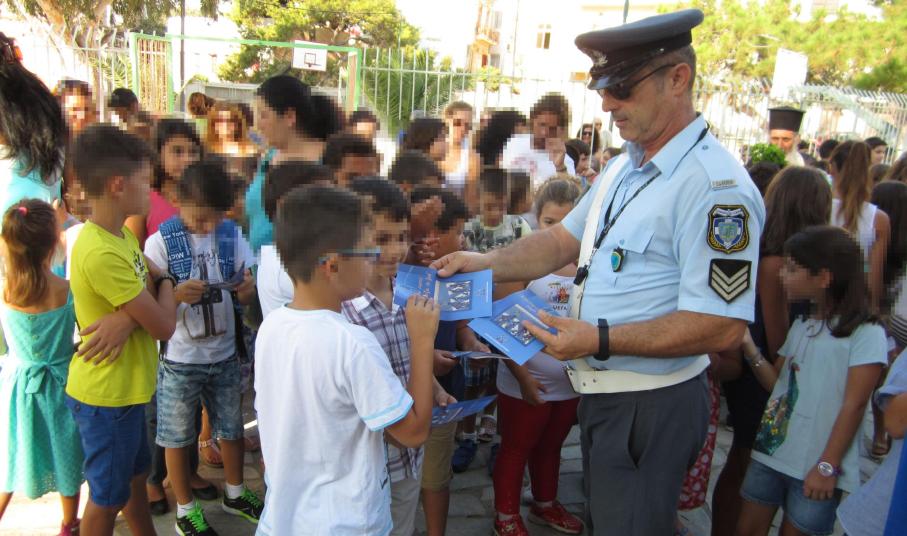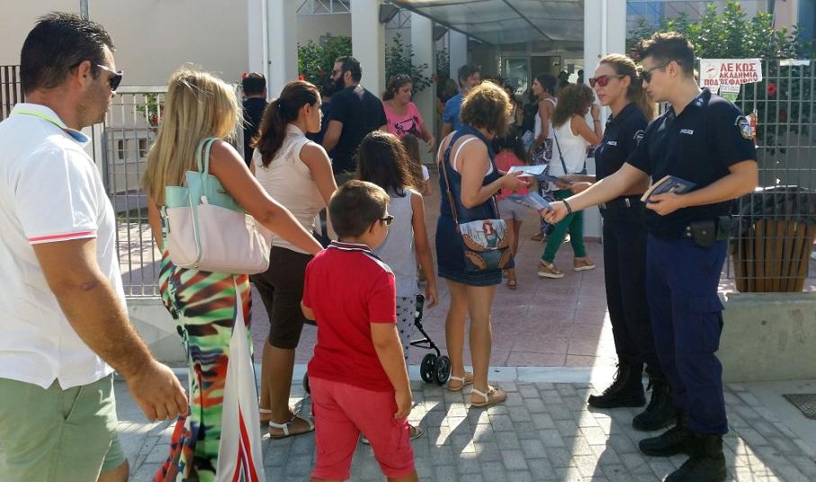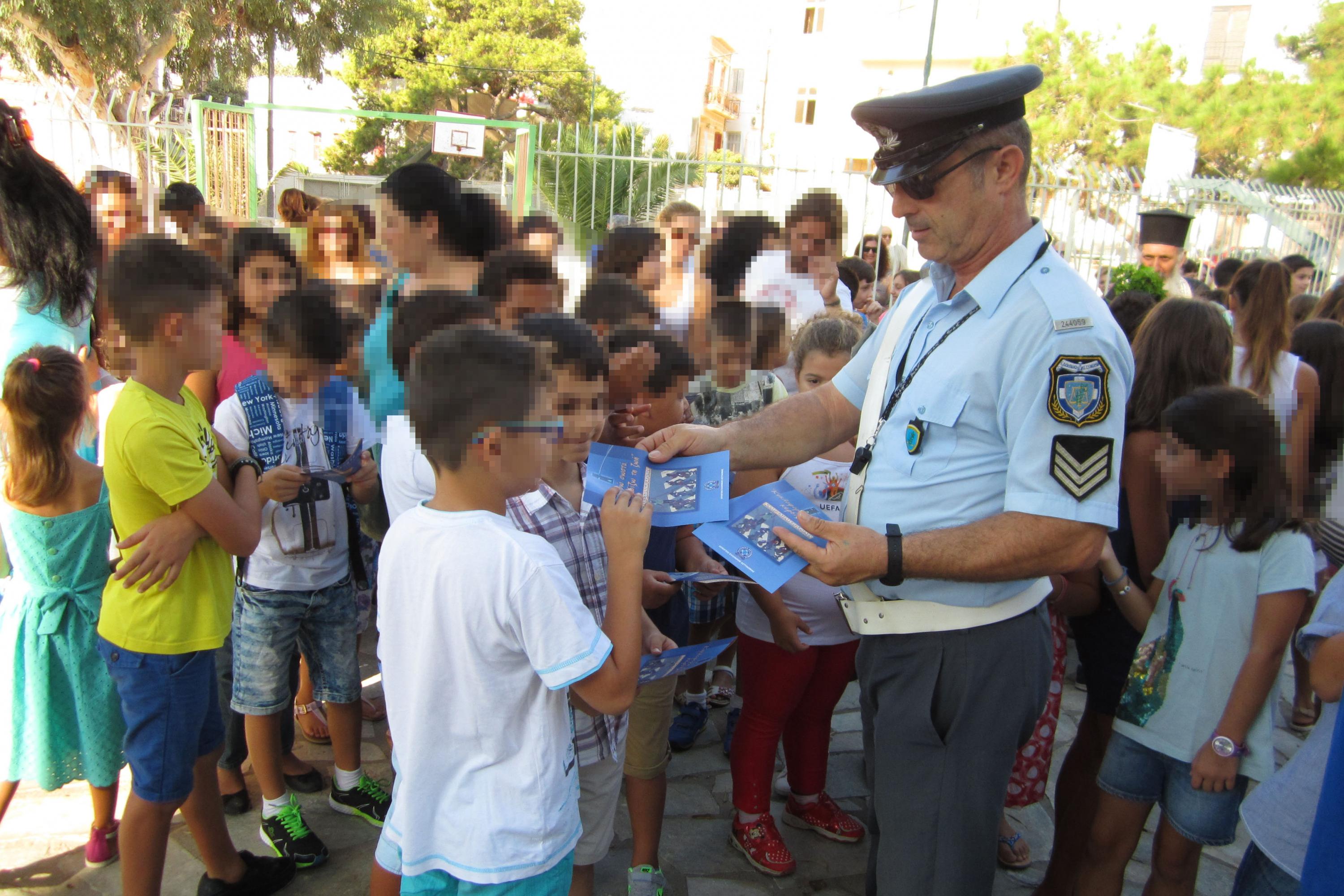 Ενημερωτικά φυλλάδια κυκλοφοριακής αγωγής και ευχές για μια καλή σχολική χρονιά μοίρασαν χθες το πρωί, αστυνομικοί σε γονείς και μικρούς μαθητές κατά την προσέλευση τους στα σχολικά συγκροτήματα των Κυκλάδων και της Δωδεκανήσου, με αφορμή την έναρξη της νέας σχολικής χρονιάς.