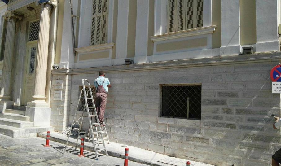 Με εντατικούς ρυθμούς συνεχίζονται οι εργασίες συντήρησης και βελτίωσης τμήματος του ημιυπόγειου και υπόγειου χώρου στο κτίριο που στεγάζεται η έδρα της Περιφέρειας Νοτίου Αιγαίου, στην πλατεία Τσιροπινά στην Ερμούπολη, καθ΄ όλη τη διάρκεια των τελευταίων ημερών.