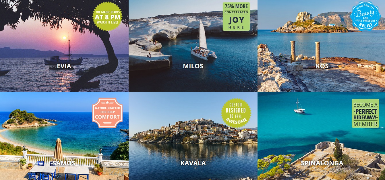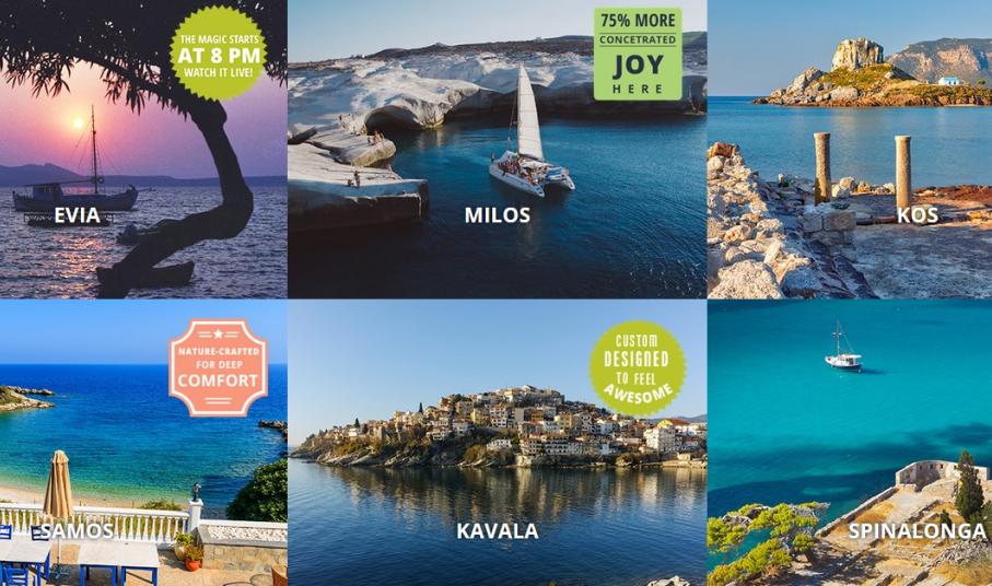 Ένα φωτογραφικό «κολάζ» προορισμών από όλες τις περιφέρειες της χώρας σε συνδυασμό με σύντομο πληροφοριακό υλικό για τον κάθε προορισμό, καλεί τον χρήστη να ταξιδέψει σε συναισθήματα και εικόνες και να κάνει άμεσα κράτηση για το ταξίδι του στην Ελλάδα. Ταυτόχρονα, ο χρήστης μπορεί μέσω του site να μοιραστεί στο λογαριασμό του στο Facebook, φωτογραφίες που θα επιλέξει και έτσι αυτόματα συμμετέχει στην κλήρωση για 3 τετραήμερα ταξίδια (3 διανυκτερεύσεις) των 2 ατόμων. Με τον τρόπο αυτό εμπλέκεται στην καμπάνια ενεργά δημιουργώντας δημοσιότητα στα κοινωνικά δίκτυα παγκοσμίως και προσδίδοντάς της “viral” χαρακτήρα.