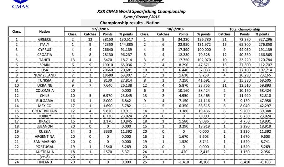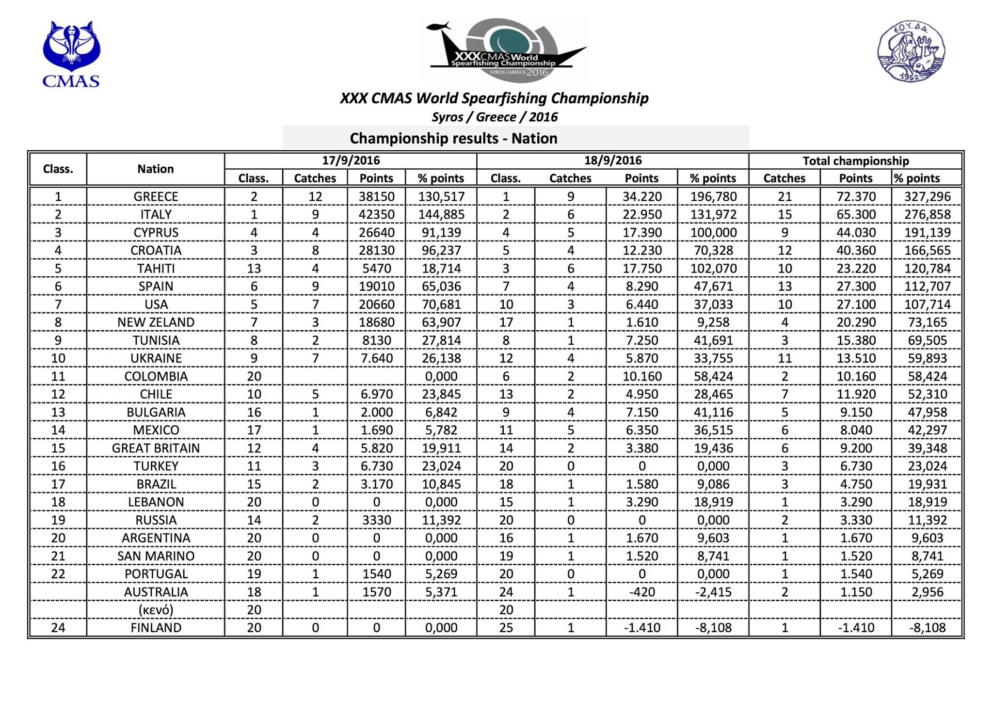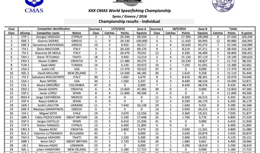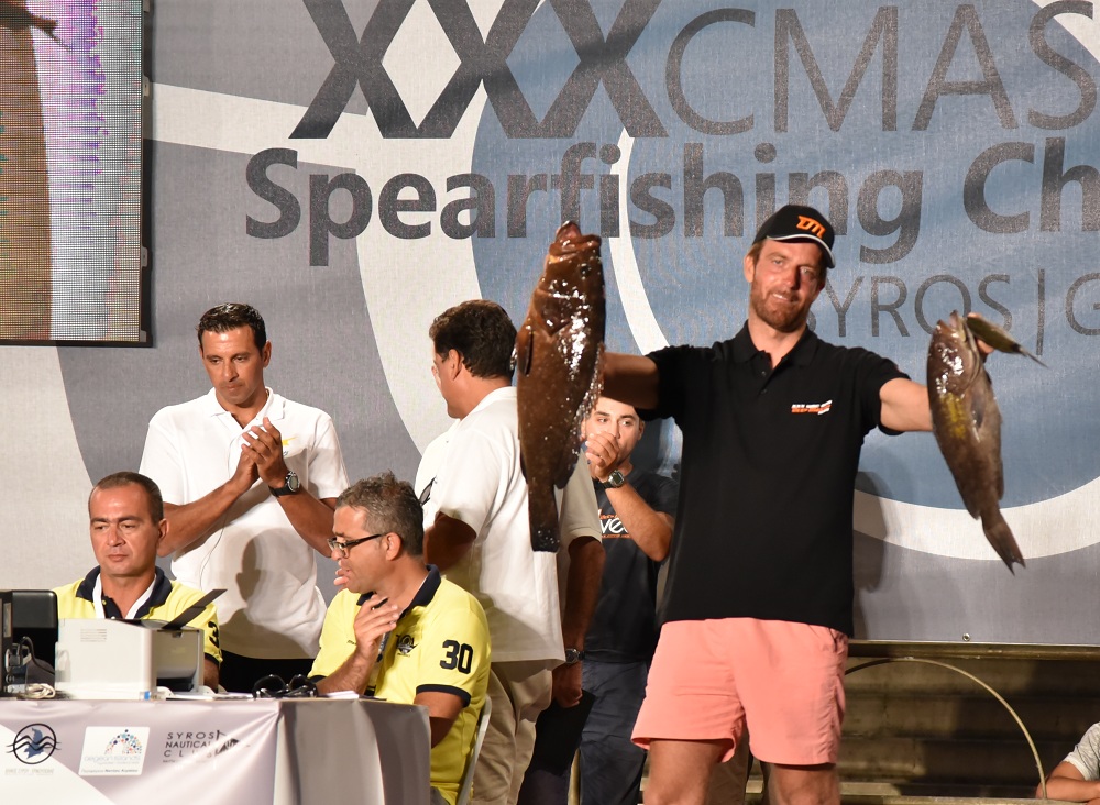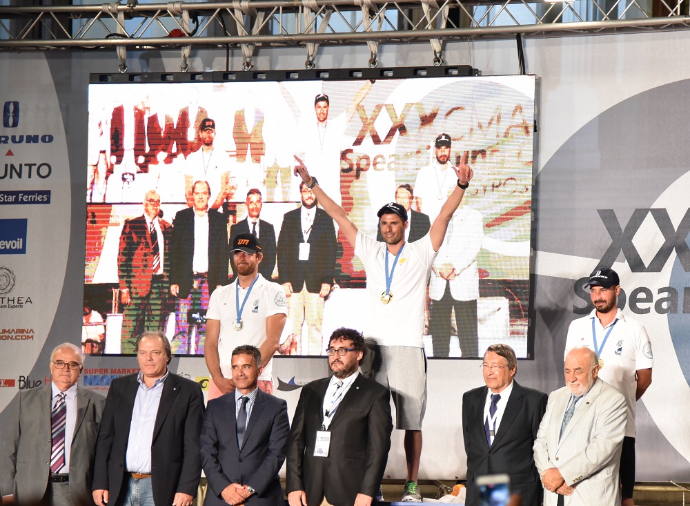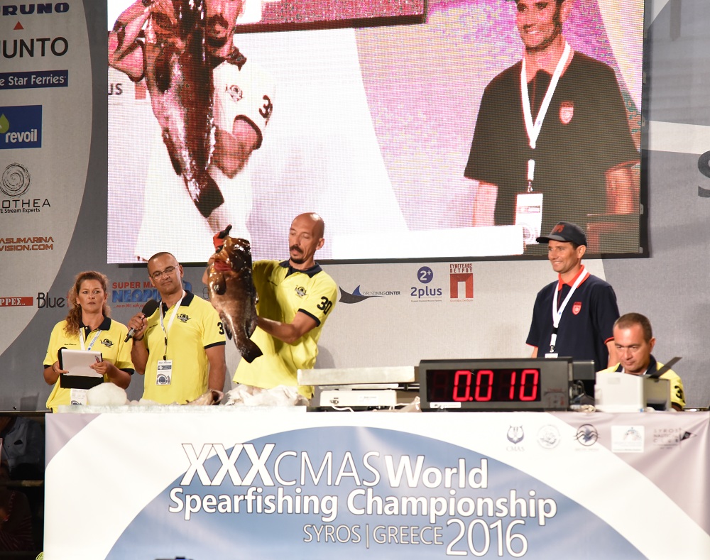 Ολοκληρώθηκε με τις απονομές και την τελετή λήξης το 30ο Παγκόσμιο Πρωτάθλημα Υποβρύχιας Αλιείας, που διεξήχθη στη Σύρο το τριήμερο που μας πέρασε. Η Σύρος έζησε για μία ακόμη φορά... μεγάλες στιγμές, αφού τα βλέμματα 25 κρατών ήταν πάνω της. 25 Εθνικές ομάδες από ολόκληρο τον κόσμο ήρθαν στη Σύρο με πολυμελές αποστολές για να διεκδικήσουν τον Παγκόσμιο τίτλο. Η... μάχη συναρπαστική, αφού η αγωνία κράτησε έως το τέλος, όπου στο... νήμα κρίθηκε και ο τίτλο. Ένας τίτλος ο οποίος μετά την μεγάλη ανατροπή κατέληξε στην Κύπρο, αφού ο Γιώργος Βασιλείου τη δεύτερη ημέρα των αγώνων ανέτρεψε τα προγνωστικά και με ωραία ψαριά, έριξε από την πρώτη θέση τον Γιάννη Σιδέρη και ανέβηκε στο υψηλότερο σκαλί του βάθρου. Να σημειώσουμε σ' αυτό το σημείο πως η "μάχη" ήταν μεγάλη, αφού τα πάντα ήταν ρευστά και η διαδικασία του ζυγίσματος άργησε και πάλι να ξεκινήσει, αφού υπήρξαν ενστάσεις και έπρεπε να παρθεί κάποια απόφαση για να αρχίσει η εκδήλωση. Ο κόσμος υπομονετικός, παρά την μεγάλη καθυστέρηση κανείς δεν έφυγε από την θέση του κι όλοι μαζί παρακολούθησαν με μεγάλη αγωνία την όλη διαδικασία η οποία είχε κι ένα συναρπαστικό φινάλε. Ο Γιώργος Βασιλείου που την πρώτη ημέρα ήταν τρίτος στο βαθμολογικό πίνακα, ανέβηκε στο υψηλότερο σκαλί του βάθρου αφήνοντας στη δεύτερη θέση τον Γιάννη Σιδέρη και τρίτο τον Γεράσιμο Καβαδία. Όπως βλέπουμε ένας αθλητής από την Κύπρο και δύο Έλληνες ήταν οι νικητές του Παγκοσμίου πρωταθλήματος. Τέλος στο ομαδικό, η Ελλάδα κατέλαβε την πρώτη θέση και ανέβηκε στο υψηλότερο σκαλί του βάθρου, ενώ ακολούθησε η αποστολή από την Ιταλία και τρίτη ήταν η Κύπρος.