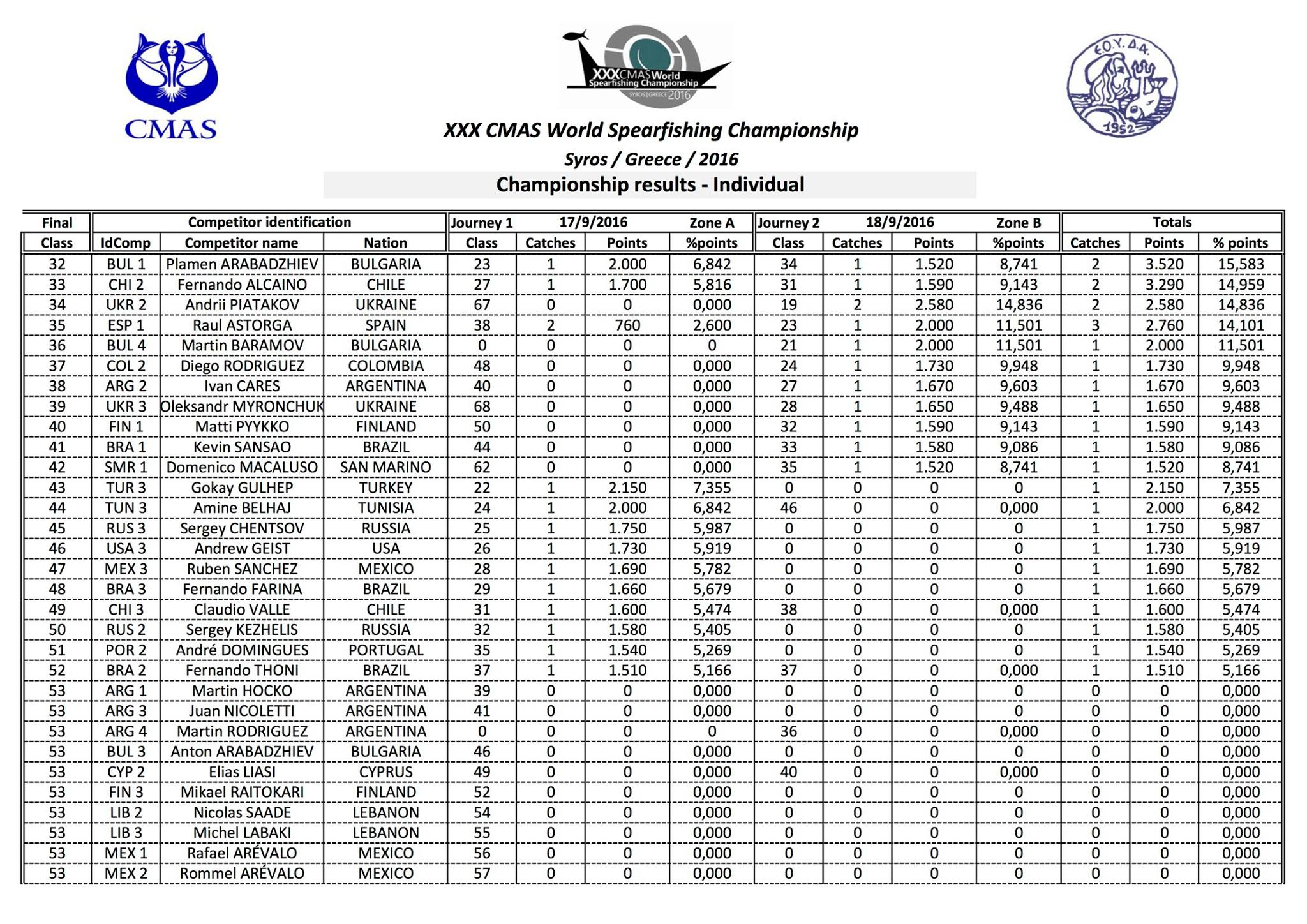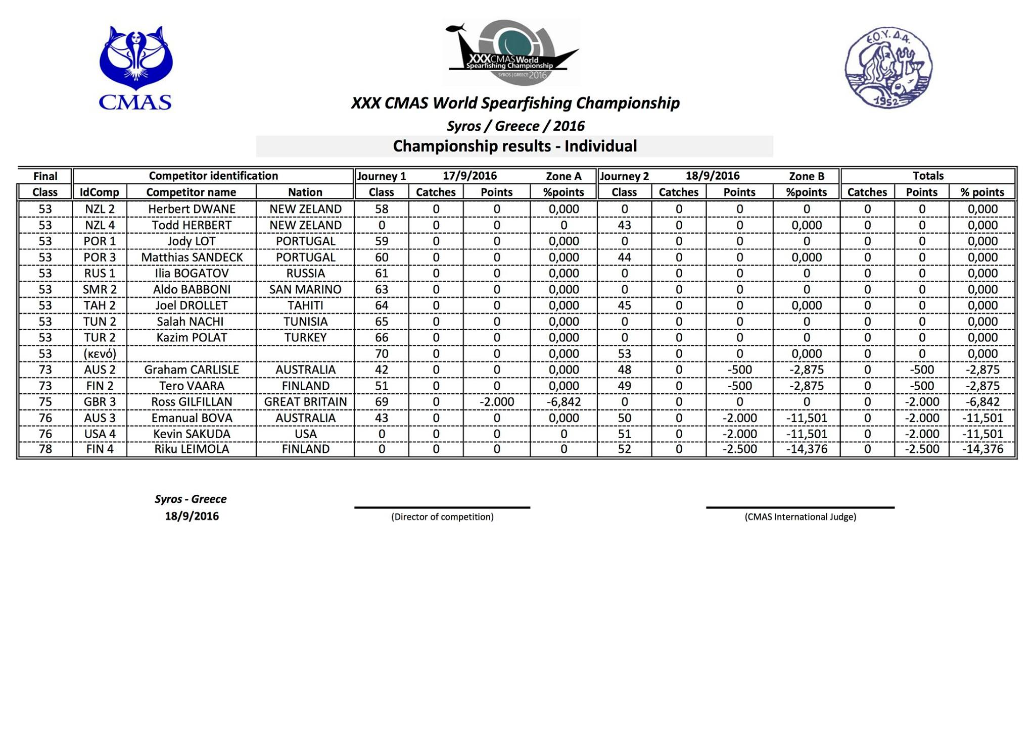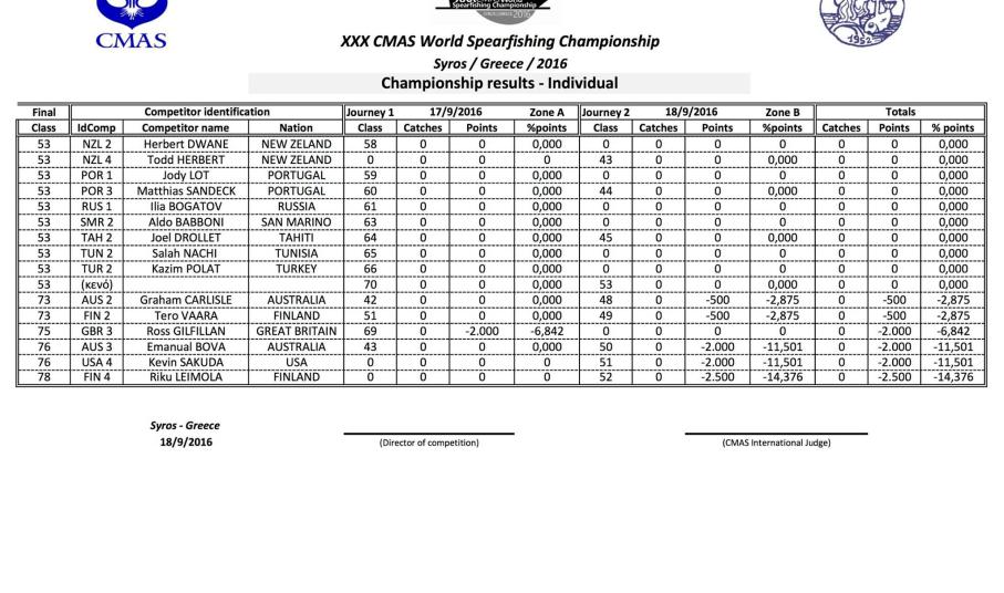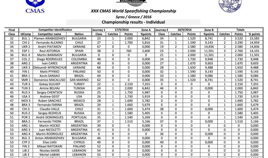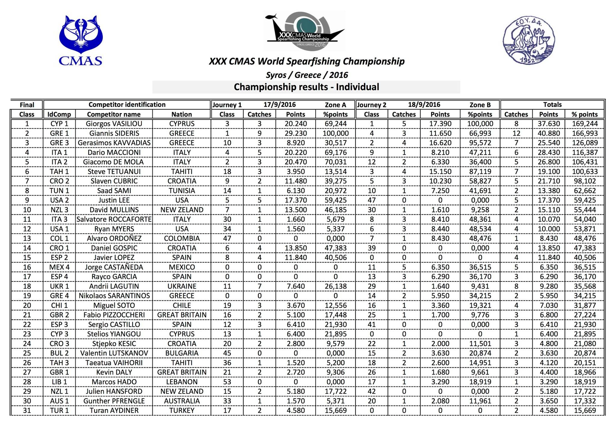 Ολοκληρώθηκε με τις απονομές και την τελετή λήξης το 30ο Παγκόσμιο Πρωτάθλημα Υποβρύχιας Αλιείας, που διεξήχθη στη Σύρο το τριήμερο που μας πέρασε. Η Σύρος έζησε για μία ακόμη φορά... μεγάλες στιγμές, αφού τα βλέμματα 25 κρατών ήταν πάνω της. 25 Εθνικές ομάδες από ολόκληρο τον κόσμο ήρθαν στη Σύρο με πολυμελές αποστολές για να διεκδικήσουν τον Παγκόσμιο τίτλο. Η... μάχη συναρπαστική, αφού η αγωνία κράτησε έως το τέλος, όπου στο... νήμα κρίθηκε και ο τίτλο. Ένας τίτλος ο οποίος μετά την μεγάλη ανατροπή κατέληξε στην Κύπρο, αφού ο Γιώργος Βασιλείου τη δεύτερη ημέρα των αγώνων ανέτρεψε τα προγνωστικά και με ωραία ψαριά, έριξε από την πρώτη θέση τον Γιάννη Σιδέρη και ανέβηκε στο υψηλότερο σκαλί του βάθρου. Να σημειώσουμε σ' αυτό το σημείο πως η "μάχη" ήταν μεγάλη, αφού τα πάντα ήταν ρευστά και η διαδικασία του ζυγίσματος άργησε και πάλι να ξεκινήσει, αφού υπήρξαν ενστάσεις και έπρεπε να παρθεί κάποια απόφαση για να αρχίσει η εκδήλωση. Ο κόσμος υπομονετικός, παρά την μεγάλη καθυστέρηση κανείς δεν έφυγε από την θέση του κι όλοι μαζί παρακολούθησαν με μεγάλη αγωνία την όλη διαδικασία η οποία είχε κι ένα συναρπαστικό φινάλε. Ο Γιώργος Βασιλείου που την πρώτη ημέρα ήταν τρίτος στο βαθμολογικό πίνακα, ανέβηκε στο υψηλότερο σκαλί του βάθρου αφήνοντας στη δεύτερη θέση τον Γιάννη Σιδέρη και τρίτο τον Γεράσιμο Καβαδία. Όπως βλέπουμε ένας αθλητής από την Κύπρο και δύο Έλληνες ήταν οι νικητές του Παγκοσμίου πρωταθλήματος. Τέλος στο ομαδικό, η Ελλάδα κατέλαβε την πρώτη θέση και ανέβηκε στο υψηλότερο σκαλί του βάθρου, ενώ ακολούθησε η αποστολή από την Ιταλία και τρίτη ήταν η Κύπρος.