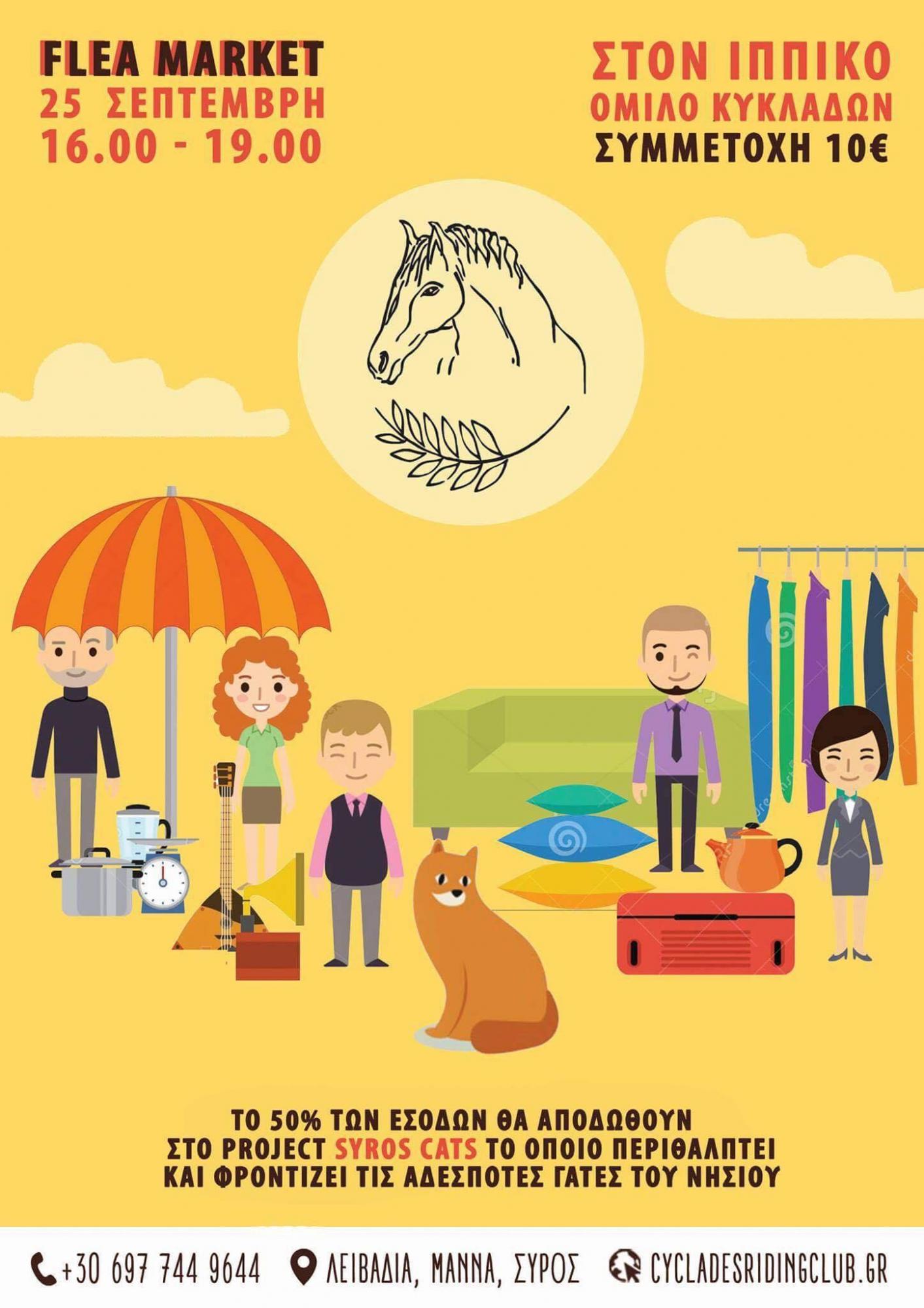 Την Κυριακή 25 Σεπτεμβρίου, από τις 16.00 έως τις 21.00 το βράδυ, ο Ιππικός Όμιλος Κυκλάδων σας προσκαλεί στις εγκαταστάσεις του, στο Μάννα της Σύρου. Στο Flea Market που διοργανώνεται θα έχει ο καθένας την ευκαιρία να ανταλλάξει πράγματα, να γνωρίσει την εναλλακτική χρήση παλιών αντικειμένων και να αντιληφθεί την αξία του παλιού όταν αυτό μεταποιείται σε κάτι νέο. Βρες μικρούς θησαυρούς μέσα στα παλιά αντικείμενα σε τιμή "ξεφορτώματος"!!