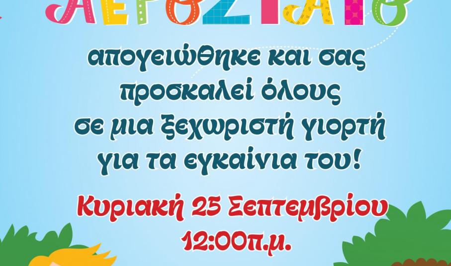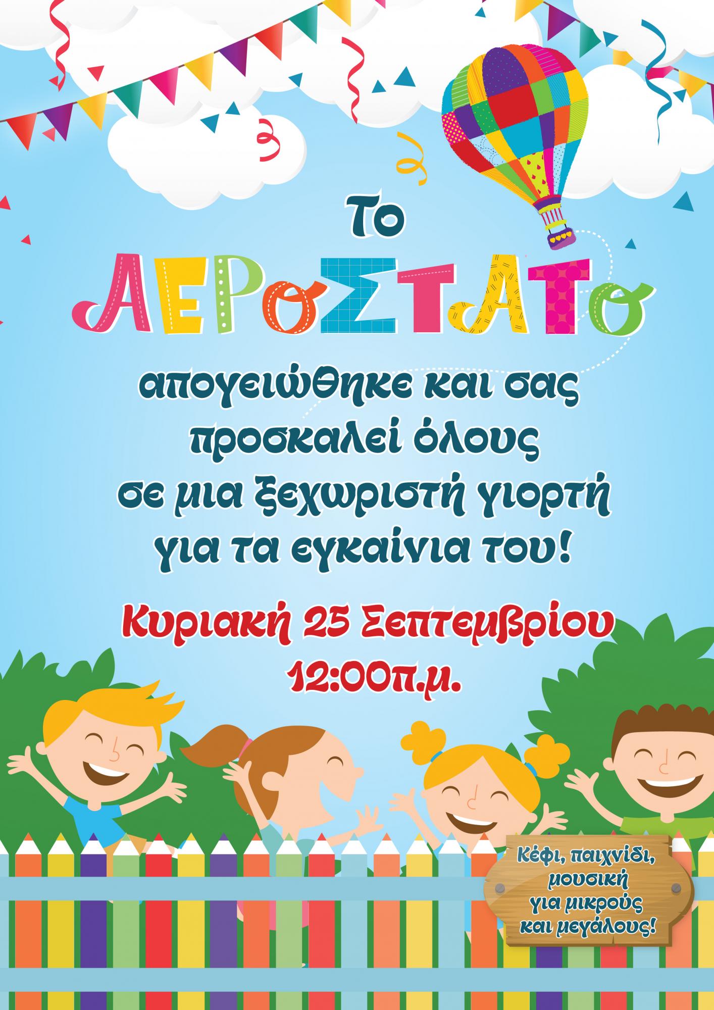 Το ταξίδι του Αερόστατου ξεκίνησε φέτος, με μεγάλο ενθουσιασμό και πολλή δημιουργία για να προσφέρει χαρα και ψυχαγωγία στα παιδιά. Το πρωινό τμήμα του, απευθύνεται σε παιδιά από 1,5 έως και 3 ετών και έχει ήδη ξεκινήσει τη λειτουργία του. Από τον Οκτώβρη προστίθεται η Μουσικοκινητική Αγωγή για παιδιά από 2,5 έως 4 ετών και τα Θαετρομύθια, ένα θεατρικό εργαστήρι για παιδιά από 7 έως 11 ετών.