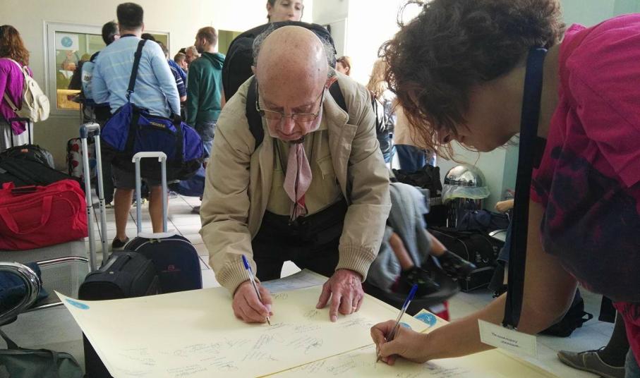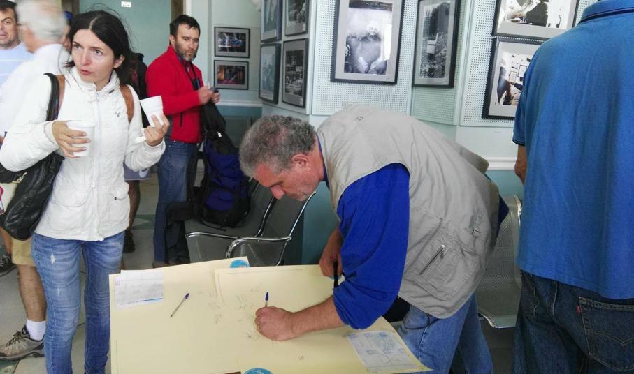 Μετά την άφιξη του πλοίου στο λιμάνι της Ερμούπολης και την αποβίβασή τους, μετακινήθηκαν στον Επιβατικό Σταθμό προκειμένου να απολαύσουν ένα λιτό κέρασμα, να πραγματοποιήσουν την εγγραφή τους και να πάρουν την απαραίτητη ενημέρωση σχετικά με την αγορά της Σύρου και τις επιλογές για την πραγματοποίηση του μεσημεριανού γεύματός τους, καθώς και για την αξιοποίηση του ελεύθερου χρόνου τους.