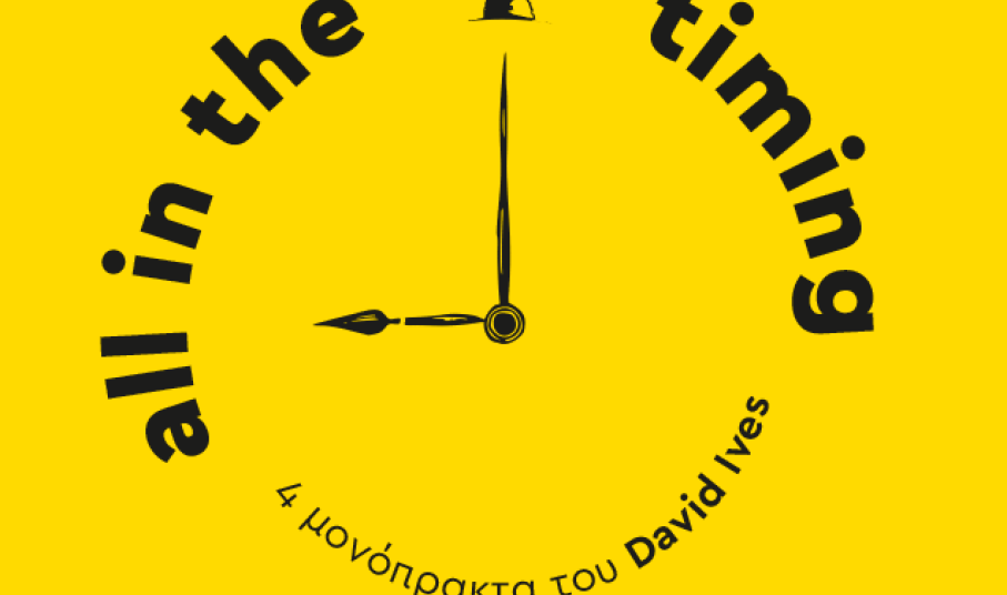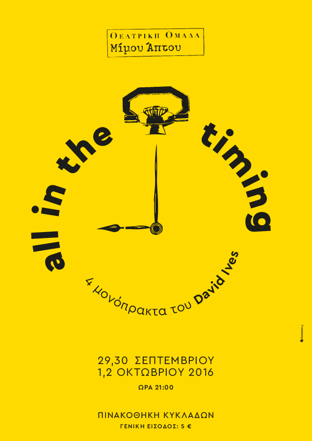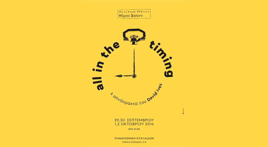 Η θεατρική ομάδα Μίμου Άπτου παρουσιάζει τέσσερα έργα από τη συλλογή μονόπρακτων του Αμερικανού συγγραφέα David Ives με τίτλο All in the Timing. Από την Πέμπτη 29 Σεπτεμβρίου και έως την Κυριακή 2 Οκτωβρίου, στις 21.00, στην Πινακοθήκη Κυκλάδων.