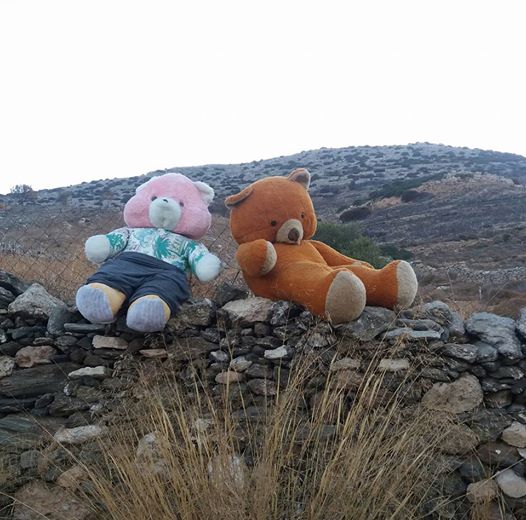 Ένα Αυγουστιάτικο πρωινό, ξεκινήσαμε με μία φίλη για το Δελφίνι. Κόβοντας από το δρόμο του Δανακού νιώσαμε δύο μάτια καρφωμένα επάνω μας. Κοιτάξαμε δεξιά και είδαμε έναν μεγάλο πορτοκαλί αρκούδο παρατημένο επάνω στο πεζούλι, να αγναντεύει το άπειρο. Η φίλη μου φρέναρε απότομα και βγήκε από το smart, με το κινητό στο χέρι. Αφού ξεκόλλησα από το παρμπρίζ, την ακολούθησα τρέχοντας, γιατί ομολογώ πως ήθελα να ανανεώσω τη φωτογραφία προφίλ μου στο facebook.