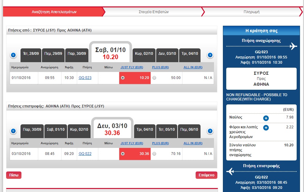 Αρ. πτήσης GQ023 Ώρα αναχώρησης 09:55 Ώρα άφιξης 10:30 - Διάρκεια πτήσης 35 λεπτά (κάθε Σάββατο)
