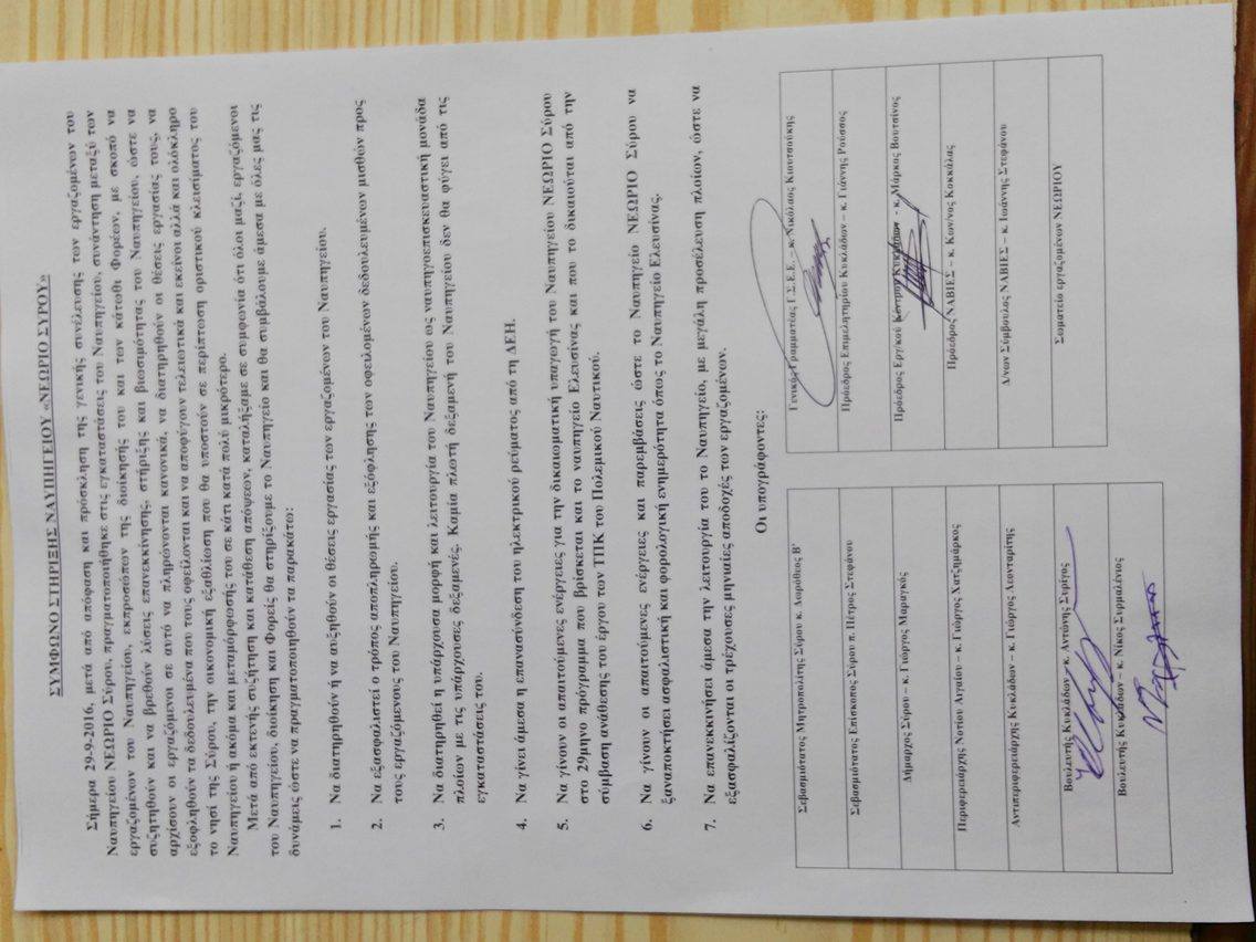 Πρόκειται για ένα αίτημα που συνοψίζει σε λίγες γραμμές τη γενική θέση των εργαζομένων, στηρίχθηκε δια ανατάσεως χειρός από την πλειοψηφία αυτών στη συνέλευση της Πέμπτης και το οποίο προτάθηκε να αποσταλεί στους αρμόδιους Υπουργούς, ή ακόμη και να επιδοθεί στον ίδιο τον Πρωθυπουργό. Παρά το γεγονός πως, ο Γιώργος Μαραγκός άνοιξε το θέμα στη συνεδρίαση της Παρασκευής, στον άξονα που είχε αναφέρει στη συνέλευση με σκοπό να έχει τη σύμφωνη γνώμη του συνόλου των αιρετών και να το υπογράψει, ωστόσο, το θέμα αποσύρθηκε με την αιτιολογία πως δεν έχει περάσει από το ΔΣ του Εργοστασιακού Σωματείου. Μάλιστα ο ίδιος, προχώρησε και σε διακοπή της συνεδρίασης του συμβουλίου, προκειμένου να έρθει σε επικοινωνία με τον πρόεδρο του Εργοστασιακού Σωματείου και να επιβεβαιώσει ή μη, αν εκείνος έχει γνώση του σχετικού συμφωνητικού στήριξης των εργαζομένων του Νεωρίου.
