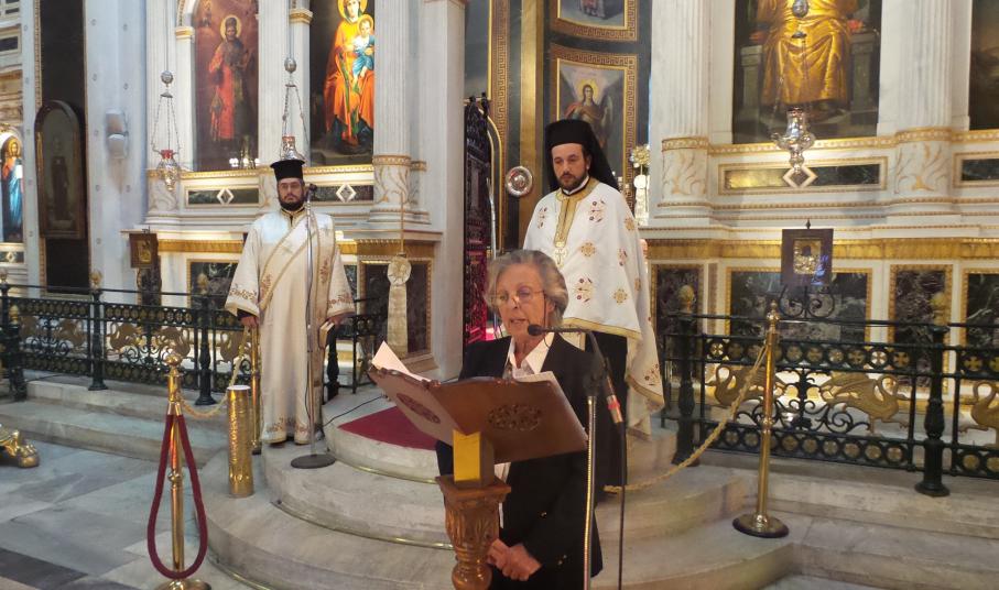 Μετά το πέρας της δοξολογίας εκφωνήθηκε ο πανηγυρικός της Ημέρας από την αρχαιολόγο, εκπρόσωπο και συνεργάτιδα της «Κοινής Γνώμης» Μαρία Ρώτα, η οποία αναφέρθηκε στον ψυχικό πλούτο και το θεάρεστο, ανθρωπιστικό και κοινωνικό έργο επιφανών Ελλήνων στο νησί της Σύρου.