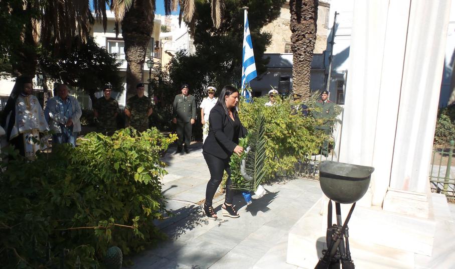 Μετά το πέρας της ομιλίας, ακολούθησε Επιμνημόσυνη Δέηση στο Εθνικό Ηρώο της πόλης και κατάθεση στεφάνων από τους εκπροσώπους της Περιφέρειας, του Δήμου, των σωμάτων ασφαλείας και λοιπών φορέων του νησιού.
