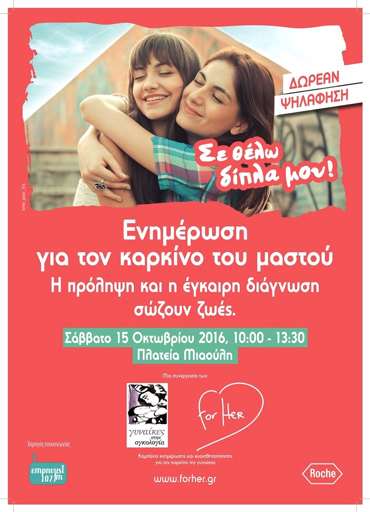Η συμμετοχή της Roche Hellas σε αυτή την ενημερωτική εκδήλωση αποτελεί μέρος της πανελλαδικής καμπάνιας ενημέρωσης και πρόληψης για τον καρκίνο της γυναίκας «for HER». H καμπάνια “for HER” που το 2016 τελεί υπό την αιγίδα της Εταιρίας Ογκολόγων Ελλάδος (ΕΟΠΕ) και την Ελληνική Εταιρία Έρευνας και Αντιμετώπισης του Ιού των θηλωμάτων (HPV) είναι αφιερωμένη στις γυναίκες αλλά απευθύνεται σε όλους, καθώς όλοι έχουμε τουλάχιστον μία σημαντική γυναίκα στη ζωή μας. Με πρωταρχικό όχημα το νέο site www.forher.gr έχει στόχο τα μηνύματά της να αγγίξουν ακόμη περισσότερες γυναίκες. Πρόκειται για την πρώτη ολιστική καμπάνια τέτοιου είδους που πραγματοποιείται στη χώρα μας και αποτελεί μία πρωτοβουλία ευαισθητοποίησης και αισιοδοξίας.