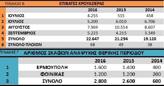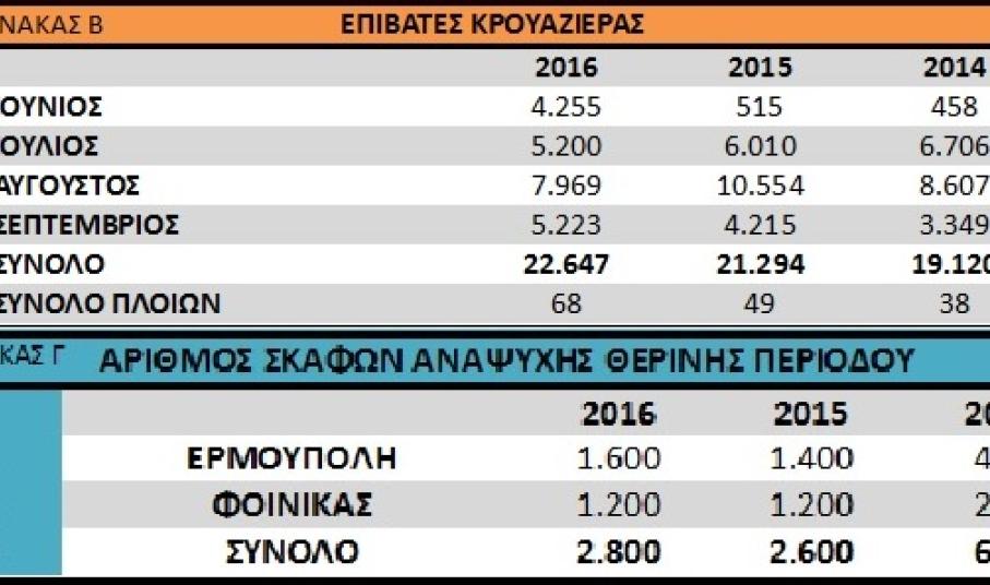 Ειδικότερα, σύμφωνα με τα επίσημα στοιχεία, η επισκεψιμότητα στον Λιμένα Ερμούπολης και τον Αερολιμένα Σύρου, για τους μήνες Ιούνιο, Ιούλιο, Αύγουστο και Σεπτέμβριο (ανά μήνα και συνολικά) παρουσιάζονται στον ακόλουθο Πίνακα Α. Ομοίως, τα στοιχεία επισκεψιμότητας στον τομέα της κρουαζιέρας (επιβάτες, πλοία) παρουσιάζονται στον ακόλουθο Πίνακα Β και τέλος, τα στοιχεία επισκεψιμότητας τουριστικών σκαφών και σκαφών αναψυχής, για τον λιμένα Ερμούπολης και τον Φοίνικα, παρουσιάζονται στον ακόλουθο Πίνακα Γ.