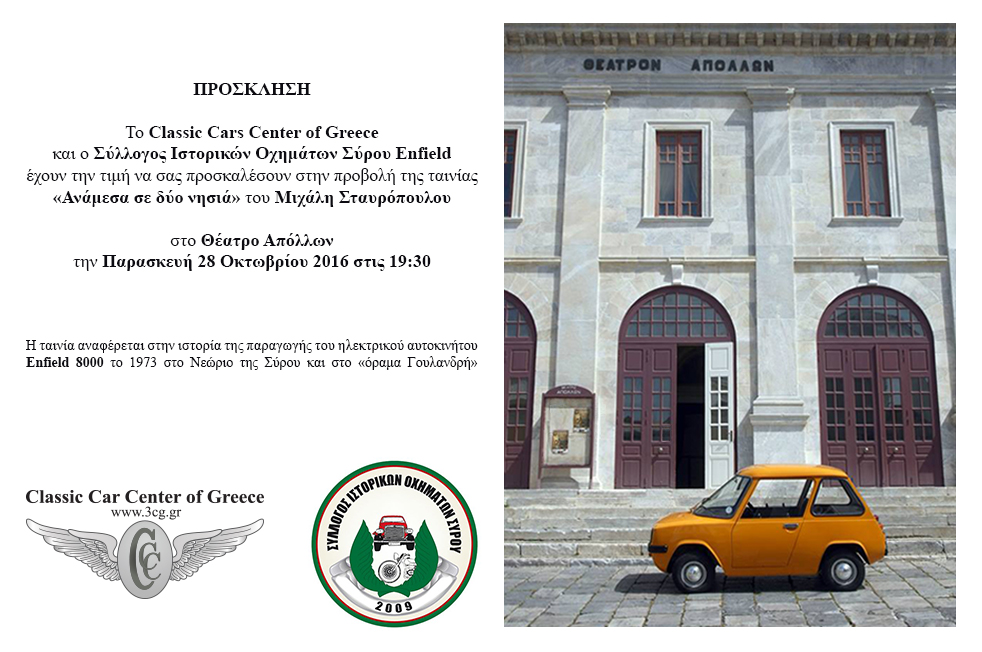 Το Classic Cars Center of Greece και ο Σύλλογος Ιστορικών Οχημάτων Σύρου Enfield έχουν την τιμή να σας προσκαλέσουν στην προβολή της ταινίας “Ανάμεσα σε δύο νησιά” του Μιχάλη Σταυρόπουλου στο θέατρο “Απόλλων”, την Παρασκευή 28 Οκτωβρίου 2016, στις 19.30.