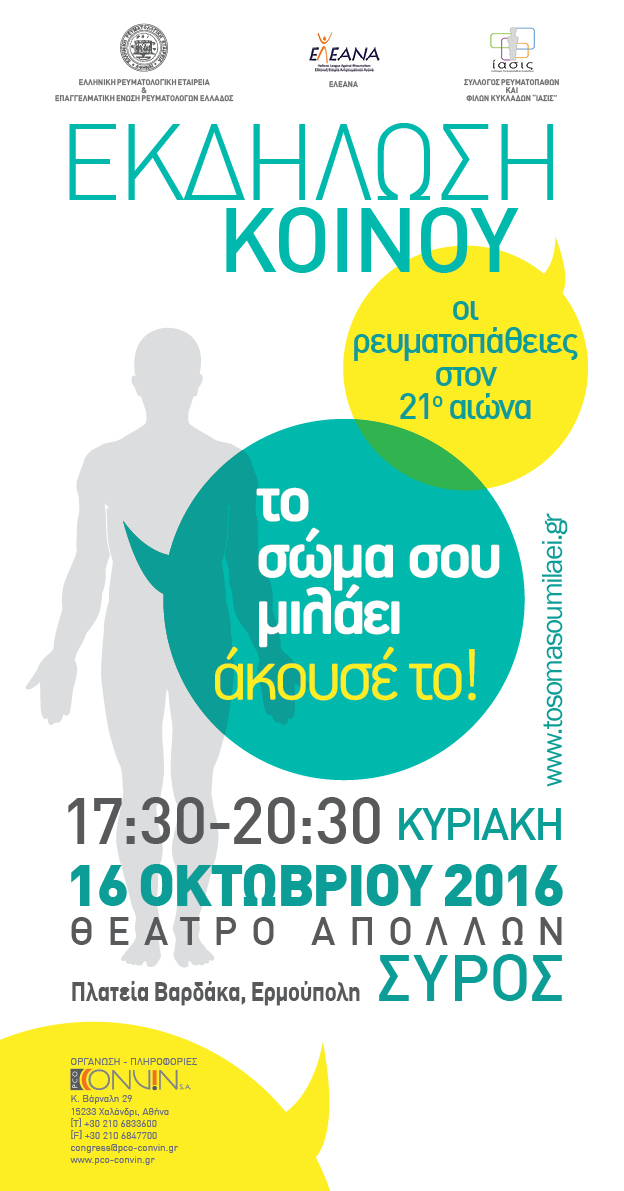 Στο πλαίσιο της Πανελλήνιας Ενημερωτικής Εκστρατείας για τις Ρευματικές Παθήσεις, η Ελληνική Ρευματολογική Εταιρεία και Επαγγελματική Ένωση Ρευματολόγων Ελλάδος «ΕΡΕ-ΕΠΕΡΕ», σε συνεργασία με την Ελληνική Εταιρεία Αντιρευματικού Αγώνα «ΕΛΕΑΝΑ» και το Σύλλογο Ρευματοπαθών και Φίλων Κυκλάδων «ΙΑΣΙΣ», πραγματοποιεί ανοιχτή εκδήλωση κοινού την Κυριακή 16 Οκτωβρίου 2016, στις 17:30, στο Θέατρο Απόλλων στην Ερμούπολη Σύρου, με θέμα οι ''Οι Ρευματοπάθειες στον 21ο αιώνα''.
