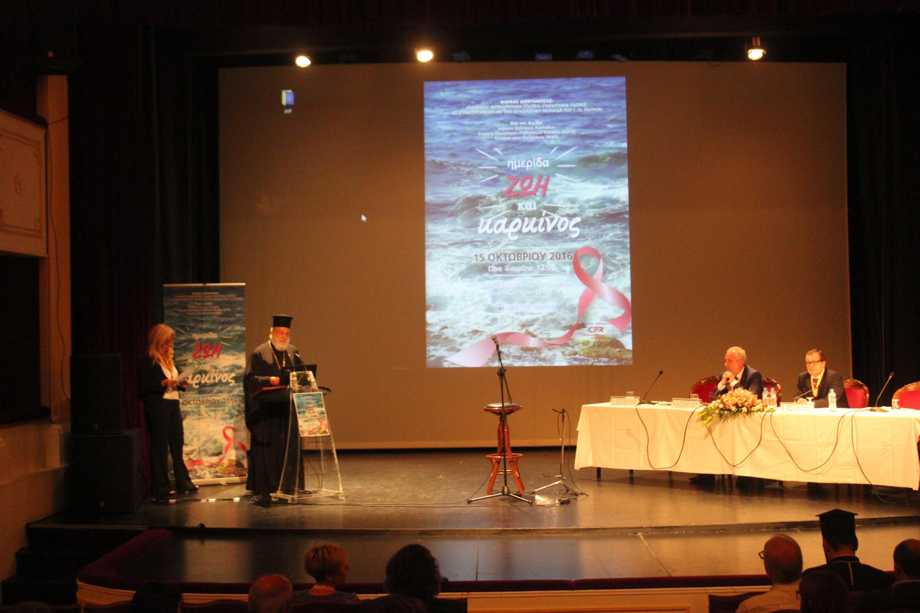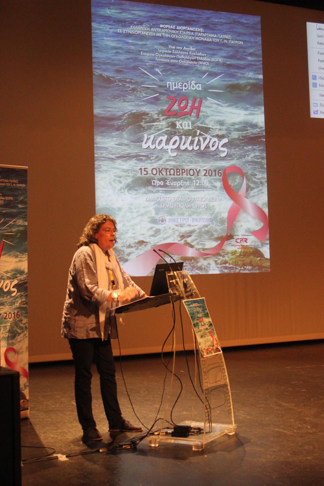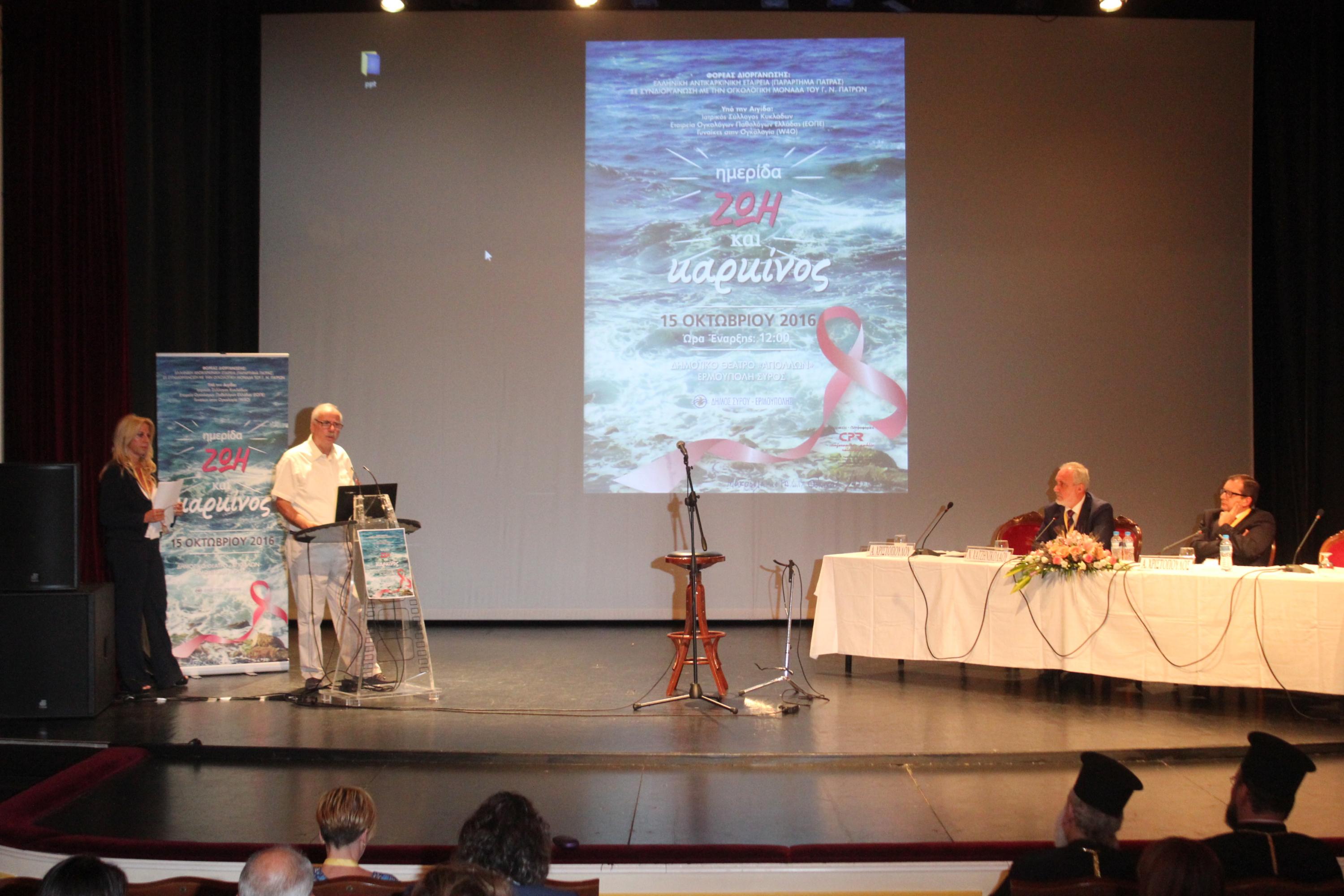 Η ημερίδα διοργανώθηκε το περασμένο Σάββατο στο Θέατρο «Απόλλων» σε συνεργασία με την Ογκολογική Μονάδα του Γενικού Νοσοκομείου Πατρών και υπό την αιγίδα του Ιατρικού Συλλόγου Κυκλάδων, της Εταιρείας Ογκολόγων Παθολόγων Ελλάδος (ΕΟΠΕ) και των Γυναικών στην Ογκολογία (W40).