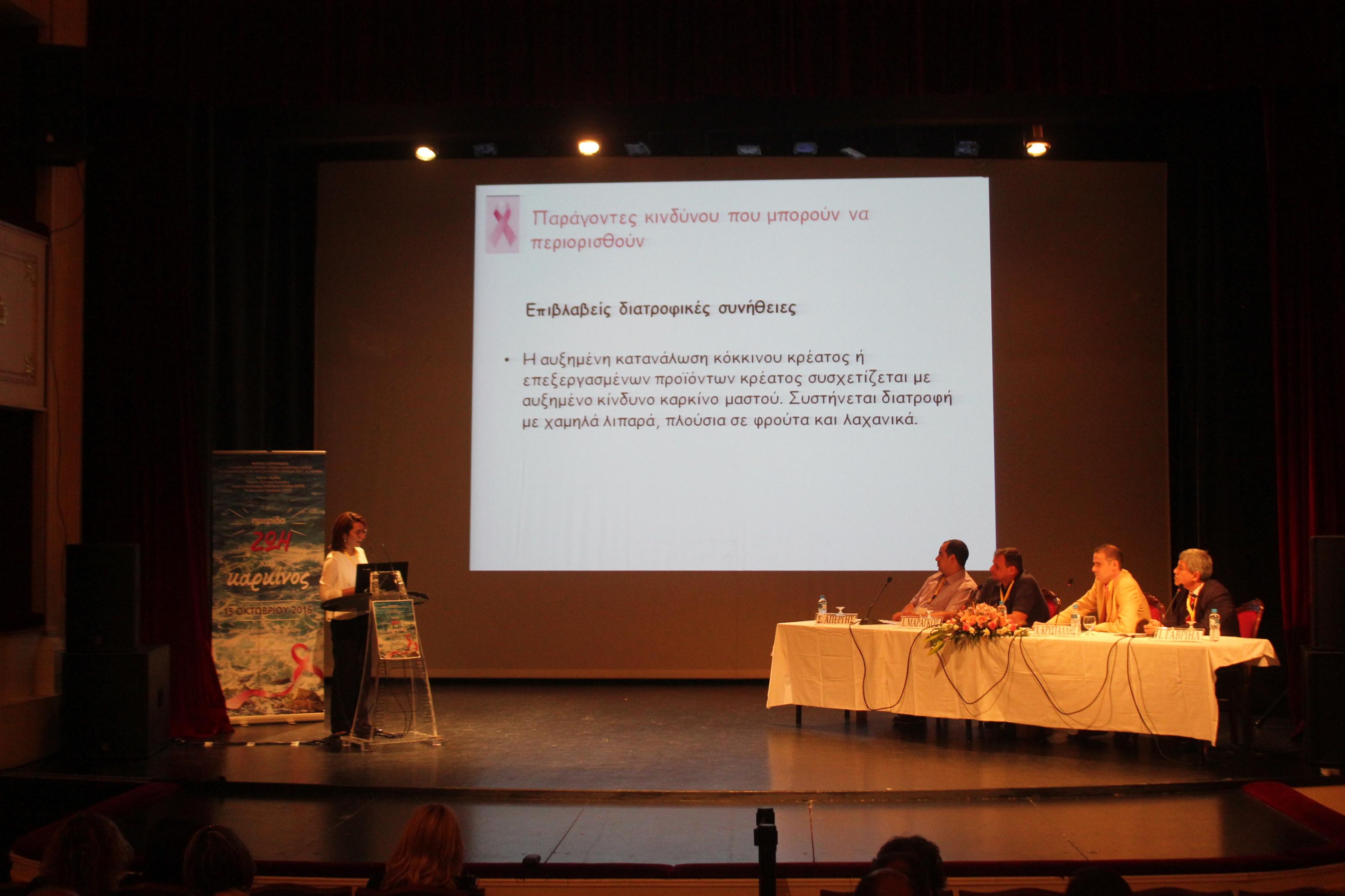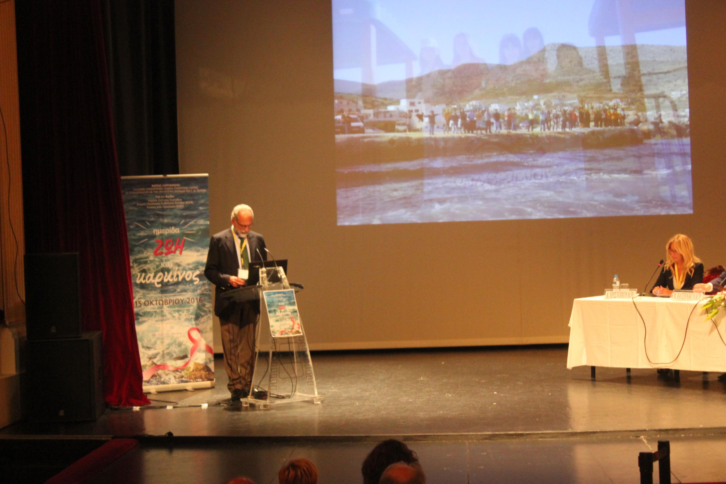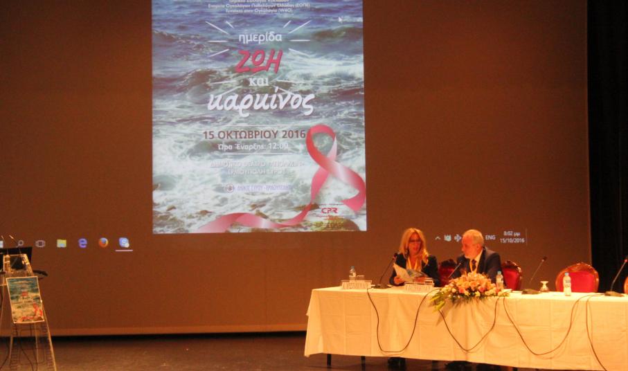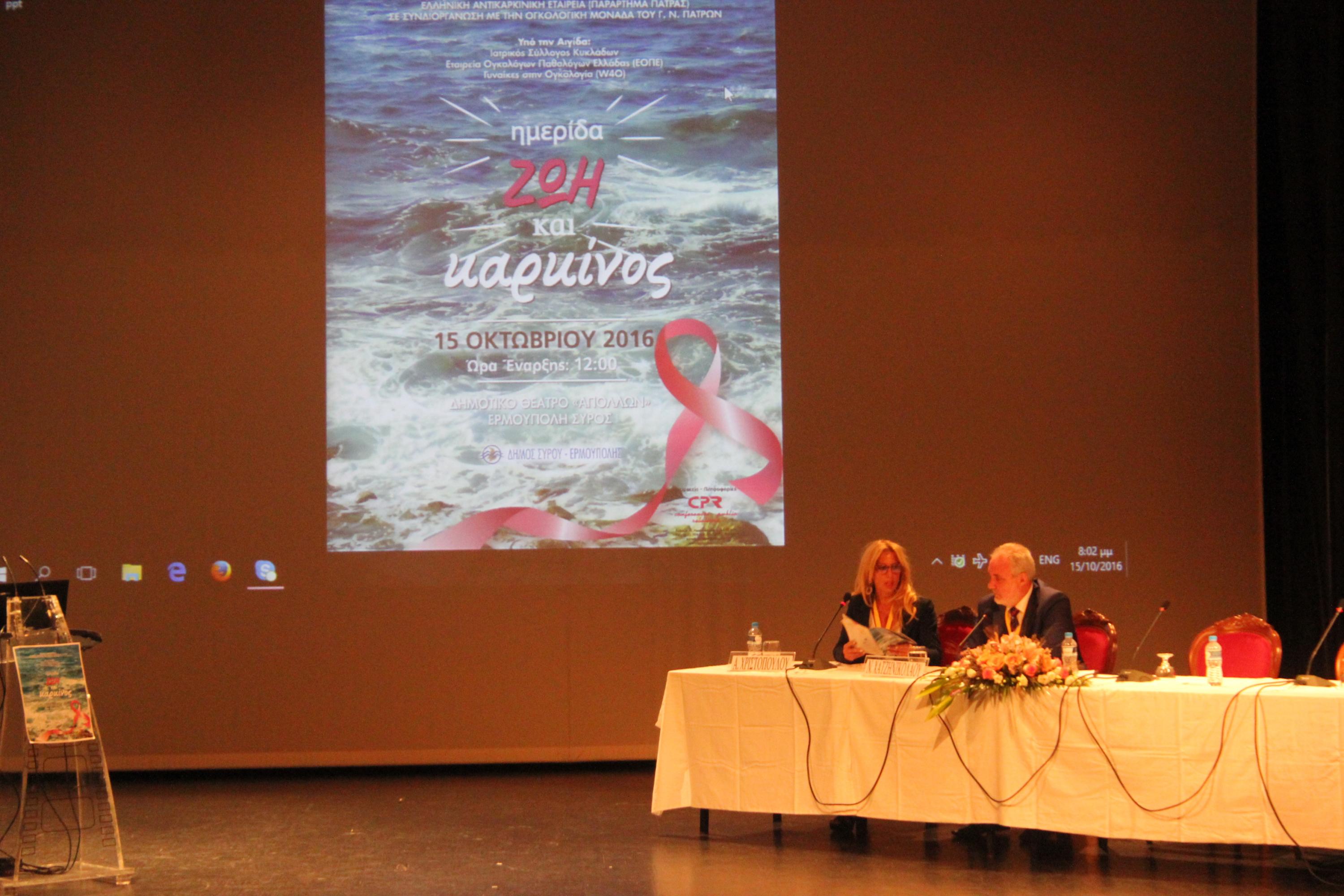 Η ημερίδα διοργανώθηκε το περασμένο Σάββατο στο Θέατρο «Απόλλων» σε συνεργασία με την Ογκολογική Μονάδα του Γενικού Νοσοκομείου Πατρών και υπό την αιγίδα του Ιατρικού Συλλόγου Κυκλάδων, της Εταιρείας Ογκολόγων Παθολόγων Ελλάδος (ΕΟΠΕ) και των Γυναικών στην Ογκολογία (W40).