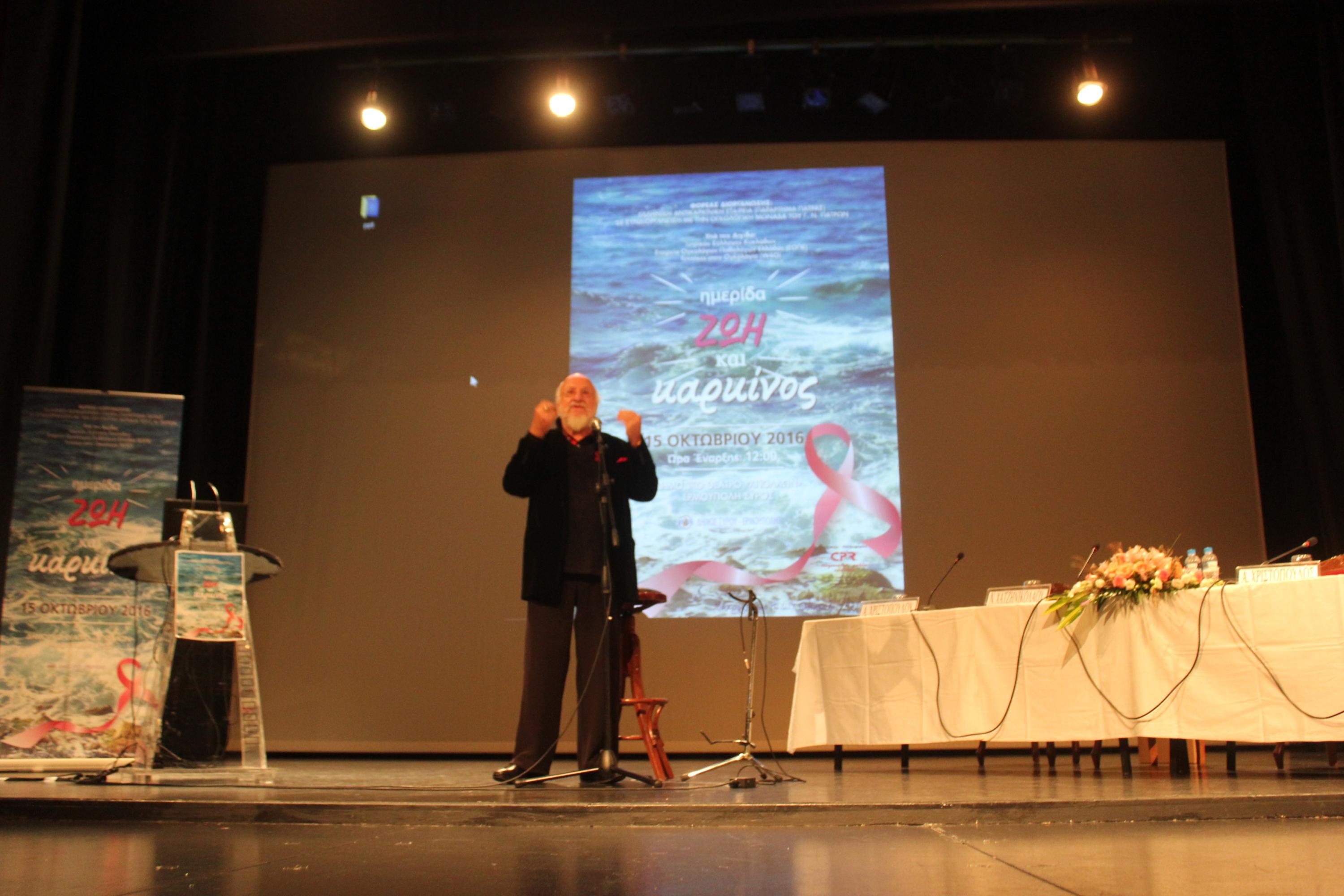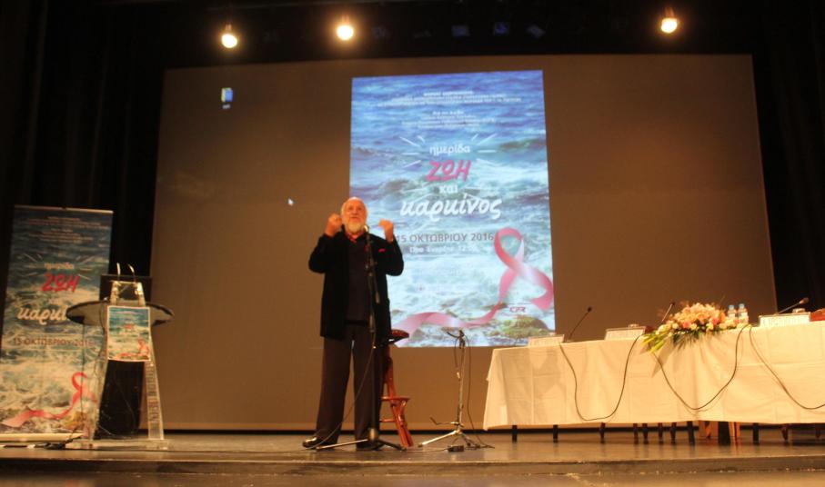 Η επιστημονική ημερίδα «Ζωή και Καρκίνος» έληξε με τον αγαπημένο τραγουδοποιό Διονύση Σαββόπουλο, ο οποίος μέσα από τα τραγούδια του έχει εμπλουτίσει στα 50 χρόνια της καλλιτεχνικής πορείας του την αισθητική και την ευαισθησία μας με τις συναισθηματικές φορτίσεις σπάνιας τρυφερότητας, έντονης αμφισβήτησης, φόβου, πόθου, πόνου, ερημιάς.