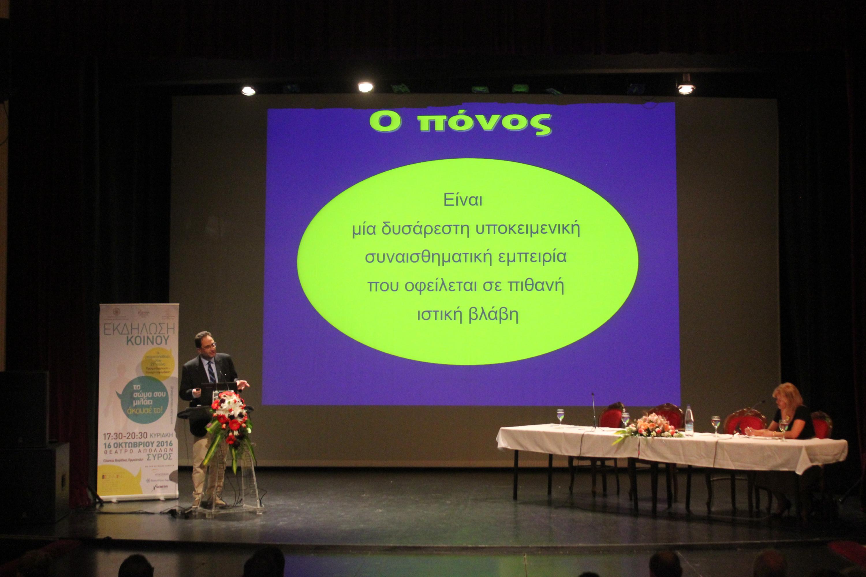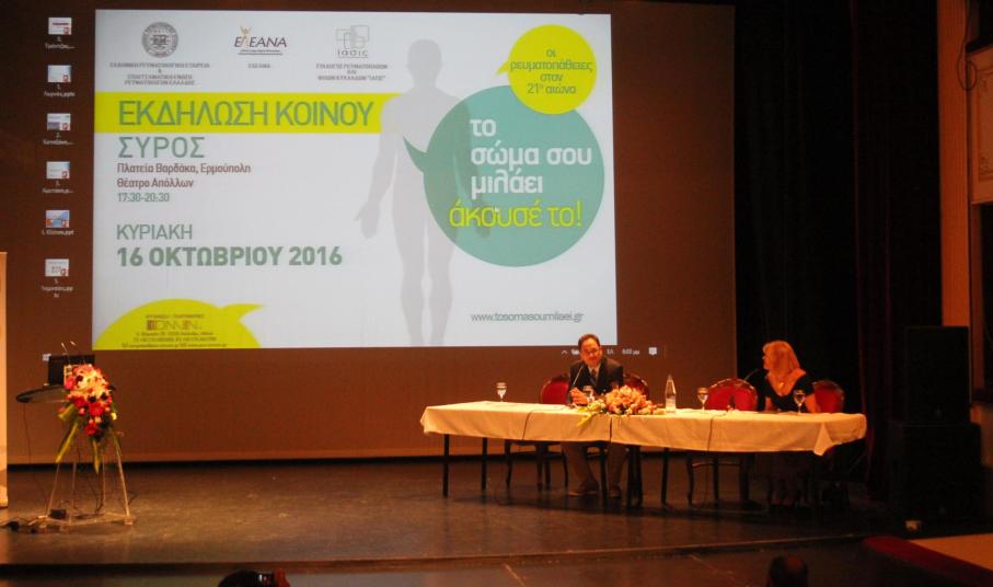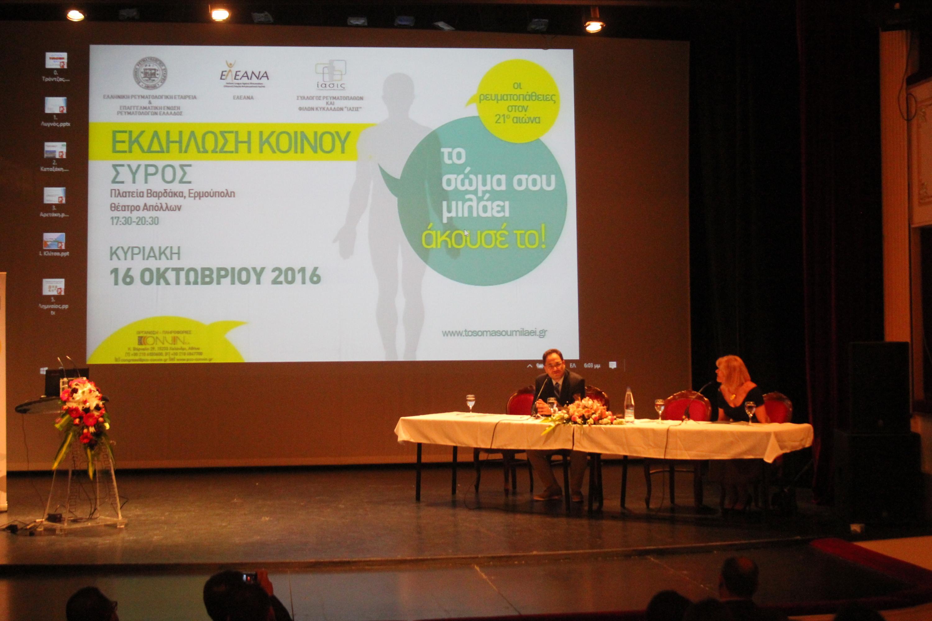 Ιατροί ρευματολόγοι καθώς και εκπρόσωποι των συλλόγων ασθενών από τη Σύρο και την Αθήνα αναφέρθηκαν στα ρευματικά νοσήματα, την επίδραση στην ποιότητα ζωής και την αντιμετώπιση τους, το ρόλο του ρευματολόγου, αλλά και τα προβλήματα που υπάρχουν στις Κυκλάδες.