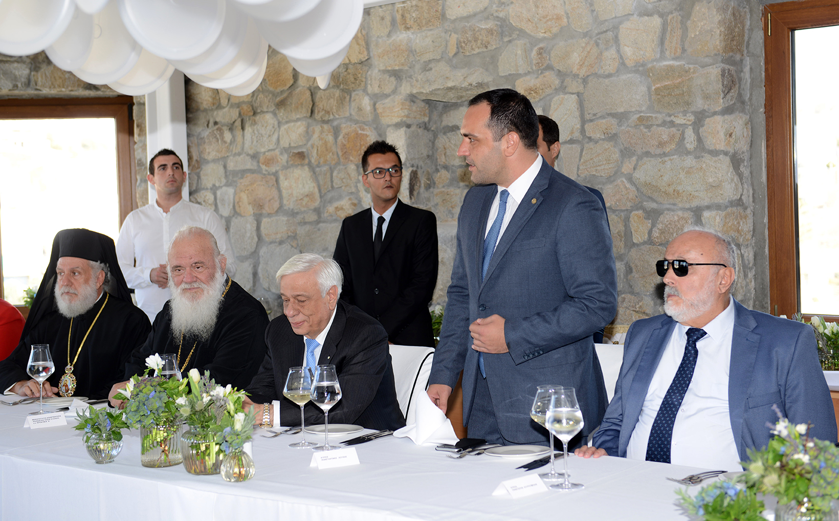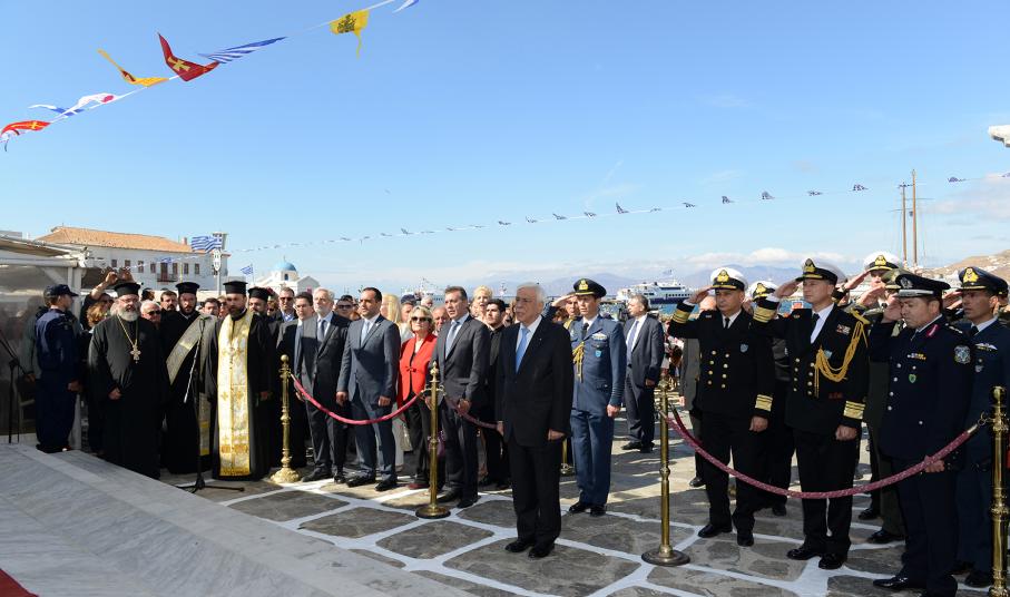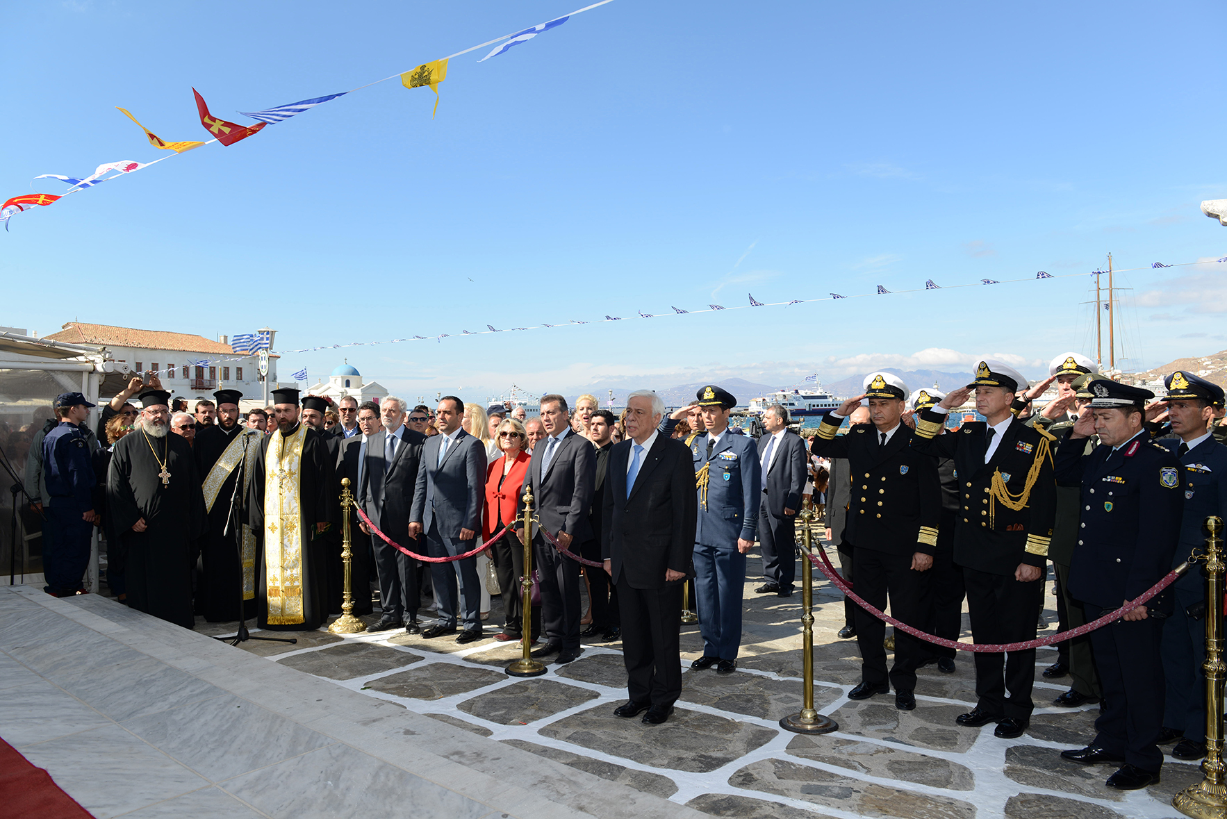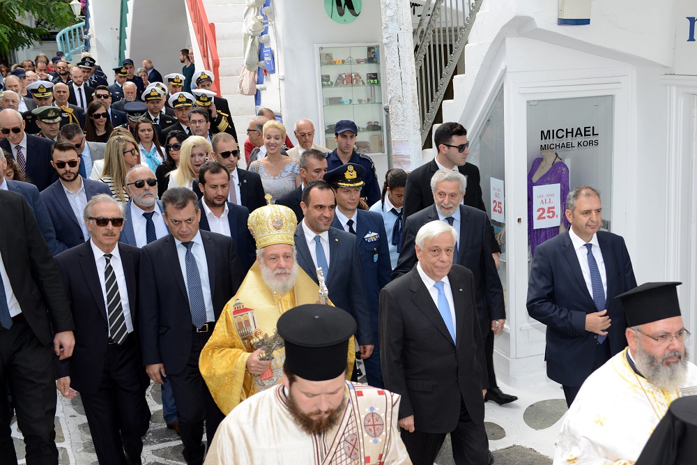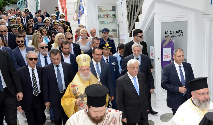 του Σεβασμιότατου Μητροπολίτη Σύρου – Μυκόνου – Δήλου κ. Δωροθέου Β', του εκπροσωπούντος την Κυβέρνηση Υπουργού Εσωτερικών κ. Παναγιώτη Κουρουμπλή, του Υπουργού Ναυτιλίας και Νησιωτικής Πολιτικής κ. Θοδωρή Δρίτσα, του Προέδρου της Ενώσεως Κεντρώων κ. Βασίλειο Λεβέντη, του Κοινοβουλευτικού Εκπροσώπου της Νέας Δημοκρατίας και Βουλευτού Κυκλάδων κ. Ιωάννη Βρούτση, του Αρχηγού του Λιμενικού Σώματος Αντιναυάρχου Λ.Σ. Σ. Ράπτη, του Γενικού Περιφερειακού Αστυνομικού Διευθυντή Ν. Αιγαίου Υποστράτηγου Κ. Τσαρντινάκη, του Διοικητή της Περιφερειακής Πυροσβεστικής Διοίκησης Ν. Αιγαίου Α. Τριπολιτσιώτη, του Διοικητού της ΠΝΒ Σύρου κ. Σ. Χαραρά , του Γεν. Γραμματέα της Προεδρίας της Δημοκρατίας κ. Γ. Γεννηματά, της Ειρηνοδίκου Μυκόνου κας Β. Παφίλη, του Αντιπεριφερειάρχη Κυκλάδων κ. Γ. Λεονταρίτη, του Αντιπεριφερειάρχη Πολιτισμού κ. Στ. Μπρίγγου, του Επάρχου Τήνου κ. Ι. Γιαγιά, της Περιφερειακής Συμβούλου κ. Μ. Χανιώτη, του Δημάρχου Νάξου κ. Μ. Μαργαρίτη, σύσσωμου του Δημοτικού Συμβουλίου Μυκόνου, των διατελεσάντων Δημάρχων Μυκόνου κ.κ. Μ. Αποστόλου, Χ. Βερώνη και Αθ. Κουσαθανά-Μέγα, των Πολιτευτών Κυκλάδων κας Αικ. Μονογυιού και κ. Γ. Χριστόπουλου, με τη συμμετοχή όλων των Κληρικών της Μυκόνου, της Σύρου και των Αθηνών, καθώς και όλων τοπικών αρχών της ΕΛ.ΑΣ., του Λιμενικού Σώματος, του Διοικητή της 6ης ΜΣΕΠ, του Αερολιμενάρχη Μυκόνου και εκπροσώπων των υπηρεσιών και συλλόγων του νησιού. Τον Πρόεδρο της Δημοκρατίας συνόδευσε σε όλες τις εκδηλώσεις η σύζυγός του κα Β. Παυλοπούλου.