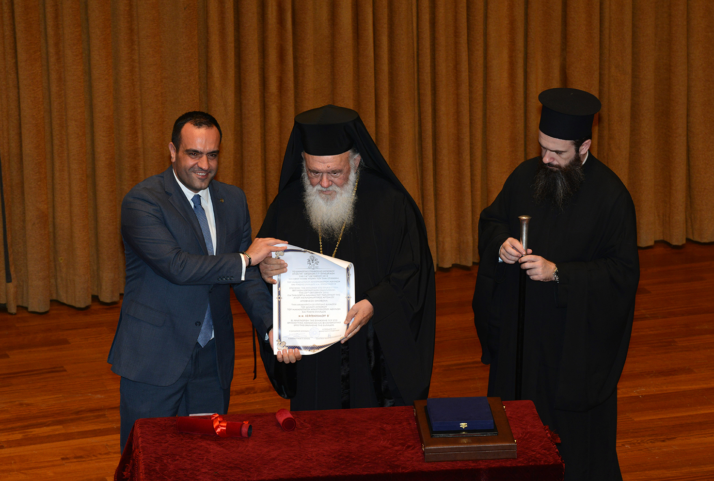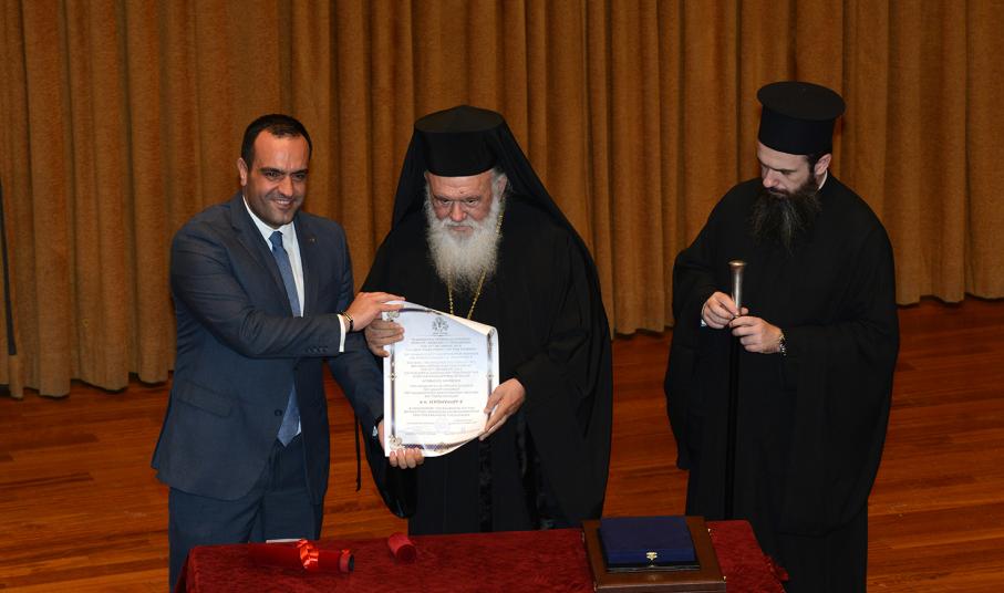 Κατά την προσφώνηση του Μακαριότατου Αρχιεπισκόπου Αθηνών και Πάσης Ελλάδας, ο Δήμαρχος Μυκόνου κ. Κωνσταντίνος Κουκάς είπε: "Με τη συμβολική κίνηση της απονομής του τίτλου του επίτιμου Δημότη Μυκόνου, στον πρώτο Αρχιεπίσκοπο που επισκέφτηκε ποτέ τη Μύκονο, σπεύδουμε όχι μόνο να σας τιμήσουμε αλλά να σας εκφράσουμε τη μεγάλη χαρά μας που είστε σήμερα ένας από εμάς, θέτοντας ισχυρά θεμέλια για ακόμη σημαντικότερες συνέργειες της Δημοτικής μας Αρχής με την τοπική Εκκλησία σε όφελος του νησιού και πρωτίστως των κατοίκων του, γιατί ο κάθε τόπος είναι οι άνθρωποί του". Στην αντιφώνησή του ο Μακαριότατος αφού δήλωσε τον ενθουσιασμό του για την πρώτη επαφή του με τη Μύκονο και τη φυσική ομορφιά της, εξήρε τον Μυκονιάτη την προκοπή και την πρόοδό του, σημειώνοντας πως η περίπτωση της Μυκόνου αποτελεί παράδειγμα για όλη την Ελλάδα.