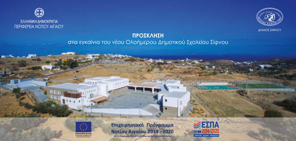 Την Κυριακή 30 Οκτωβρίου αναμένεται να πραγματοποιηθούν τα εγκαίνια του νέου Δημοτικού Σχολείου Σίφνου στην περιοχή των Φυρογείων. Η σχετική πρόσκληση επισυνάπτεται.
