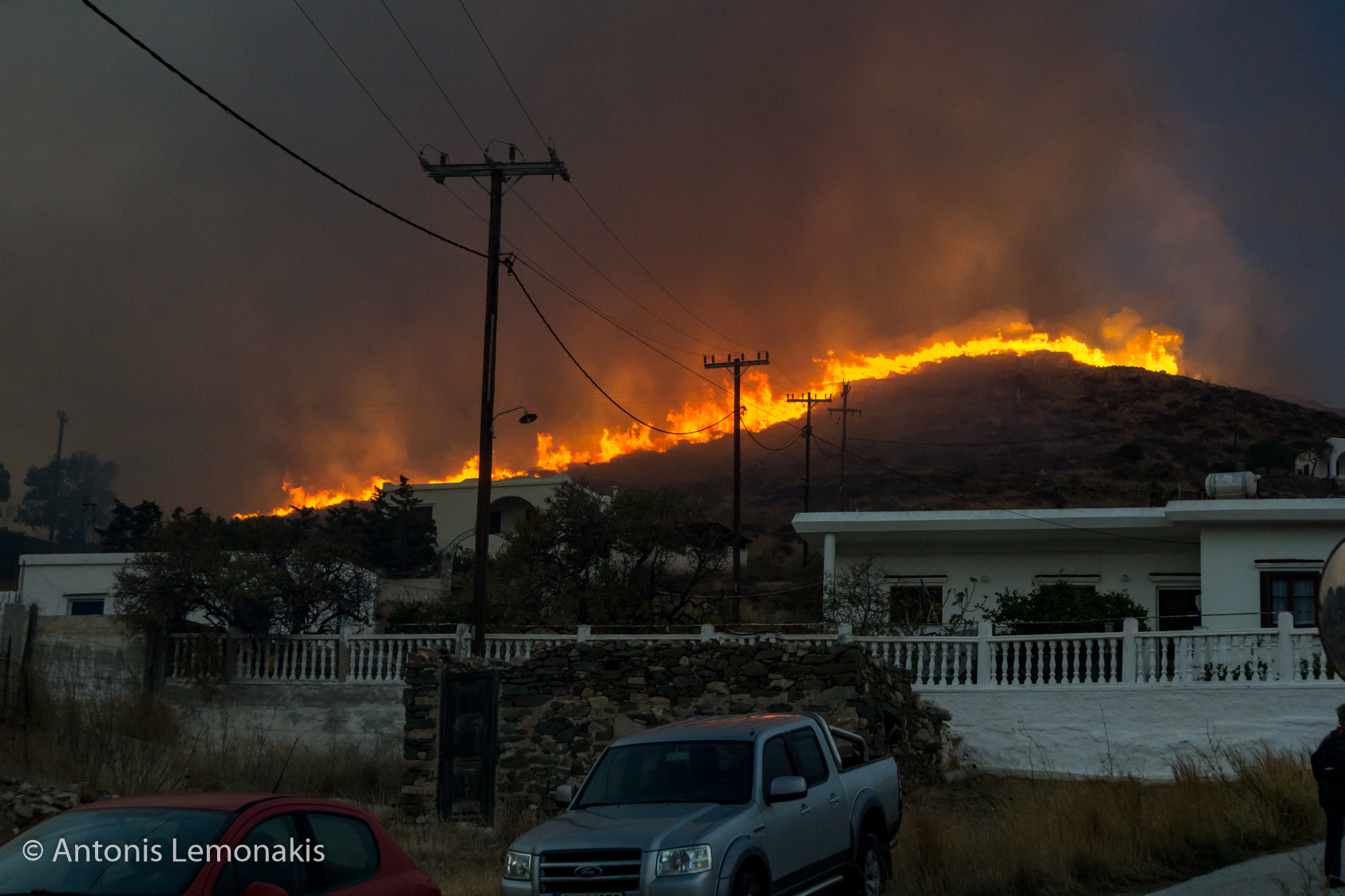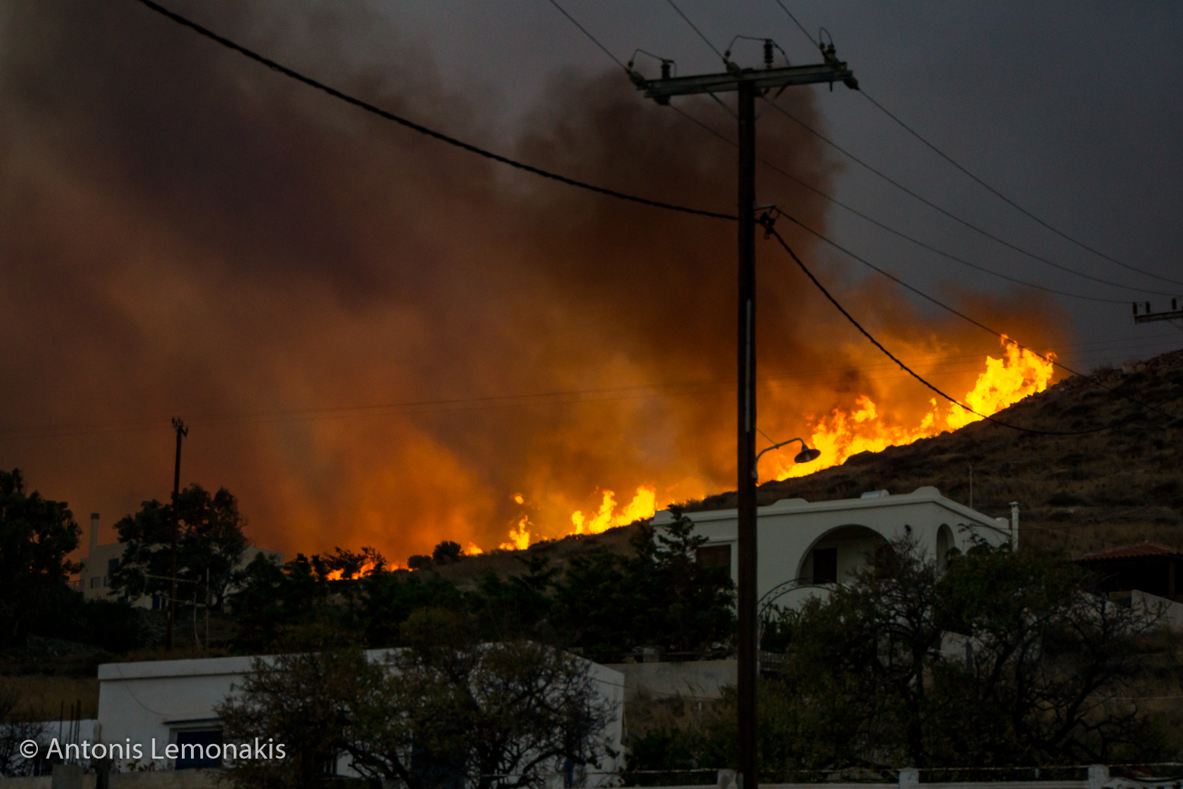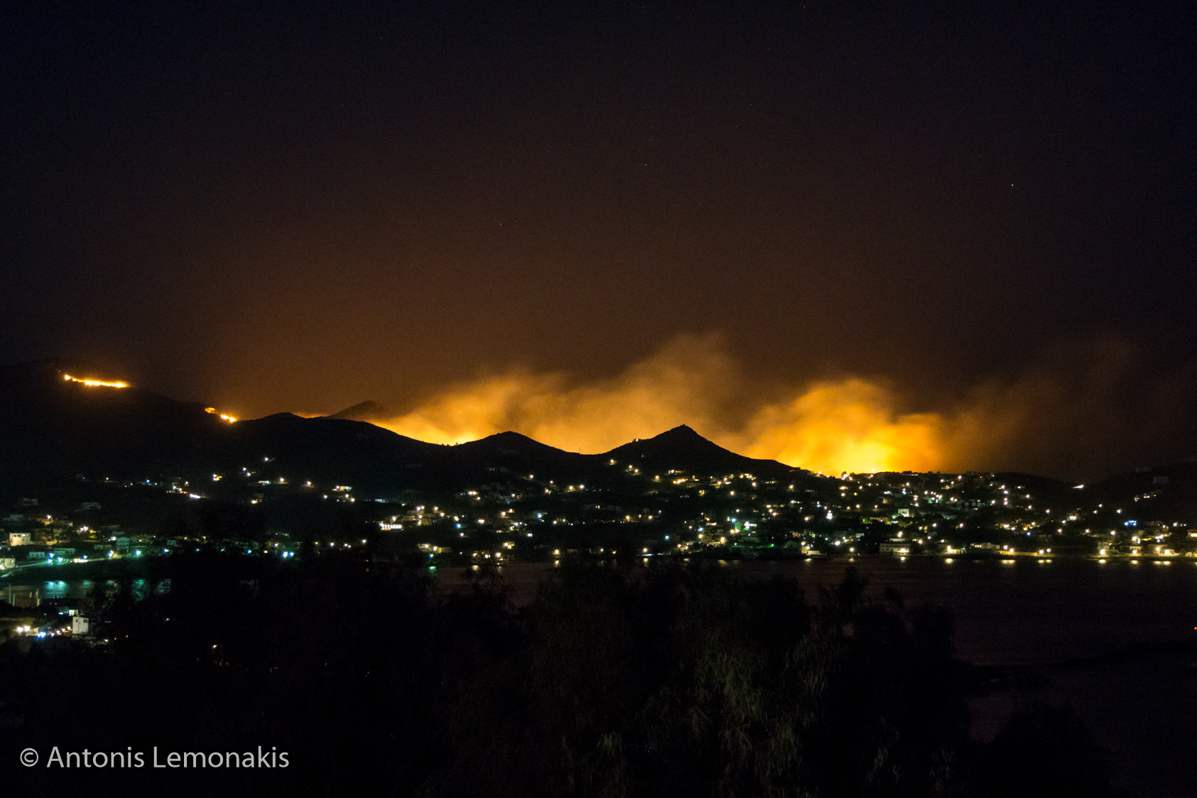 Και ενώ η μάχη με τις φλόγες μαίνονταν η πυρκαγιά έφτασε έως και το χαμηλό σημείο του κεντρικού δρόμου του Μέγα Γιαλού και άρχισε να επεκτείνεται προς την Αμπέλα και τα Τρία Λαγγόνια, από την μία πλευρά και προς την πλευρά της Βάρης από την άλλη.