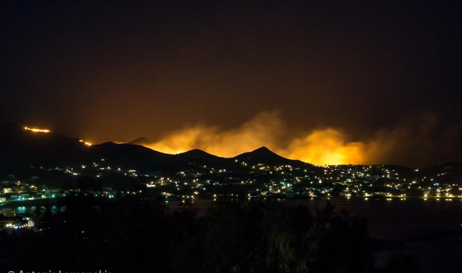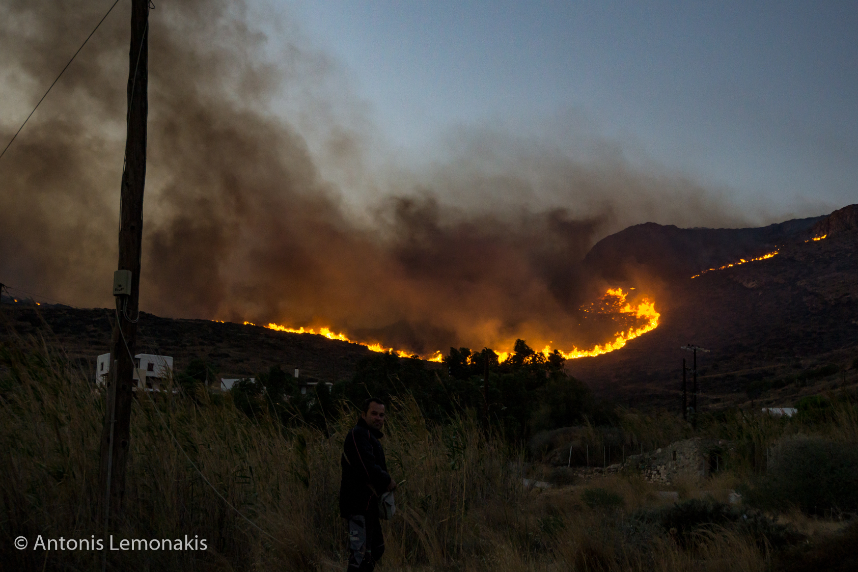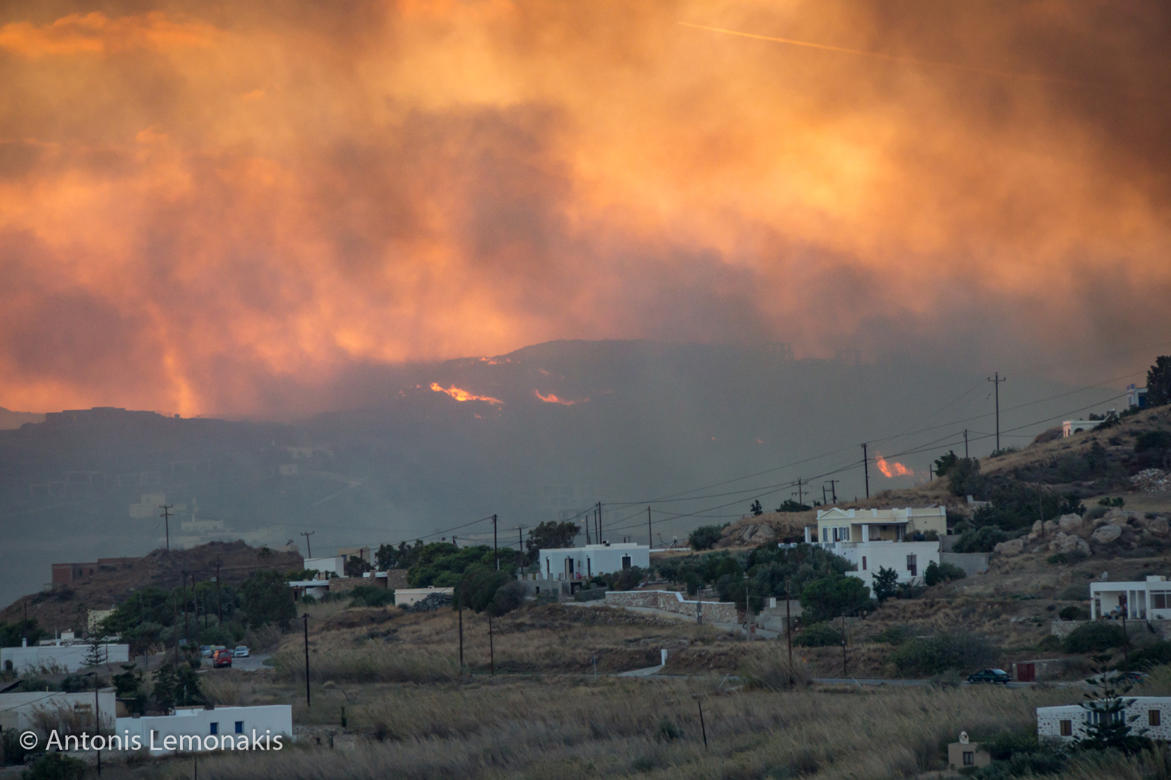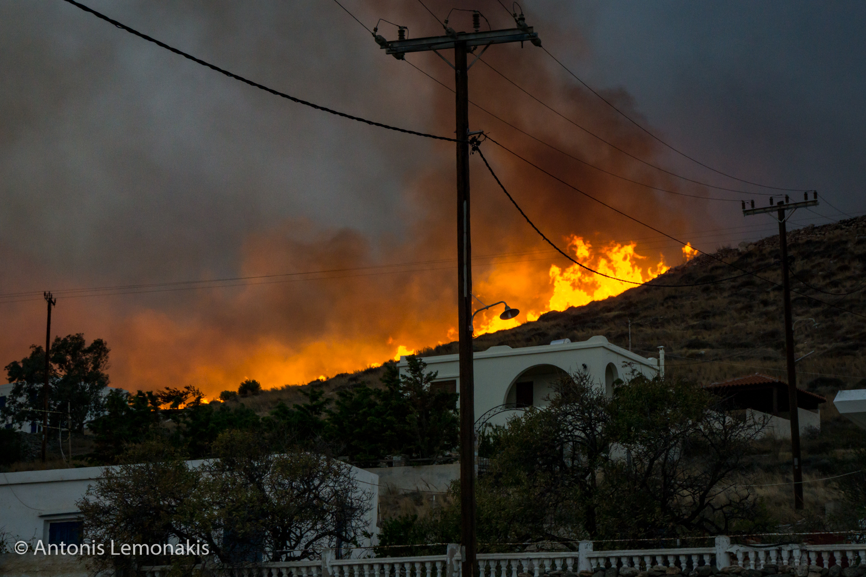 Και ενώ η μάχη με τις φλόγες μαίνονταν η πυρκαγιά έφτασε έως και το χαμηλό σημείο του κεντρικού δρόμου του Μέγα Γιαλού και άρχισε να επεκτείνεται προς την Αμπέλα και τα Τρία Λαγγόνια, από την μία πλευρά και προς την πλευρά της Βάρης από την άλλη.