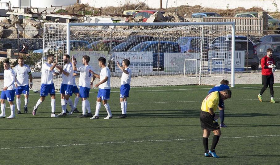 Η Άνω Μερά με τους τρεις βαθμούς έφτασαν στους εννέα και βρίσκονται πίσω από Α.Ο. Σύρου, Θύελλα Καμαρίου και Πανναξιακό. Οι Μυκονιάτες έχουν άνοιξαν το σκορ στο 17' με εκτέλεση πέναλτι του Γιόγιου, ενώ λίγο πριν το τέλος του πρώτου ημιχρόνου και πιο συγκεκριμένα στο 41' διπλασίασαν τα τέρματά τους (2-0) με ένα πολύ ωραίο σουτ του Μήτσικα, έπειτα από εκτέλεση κόρνερ.