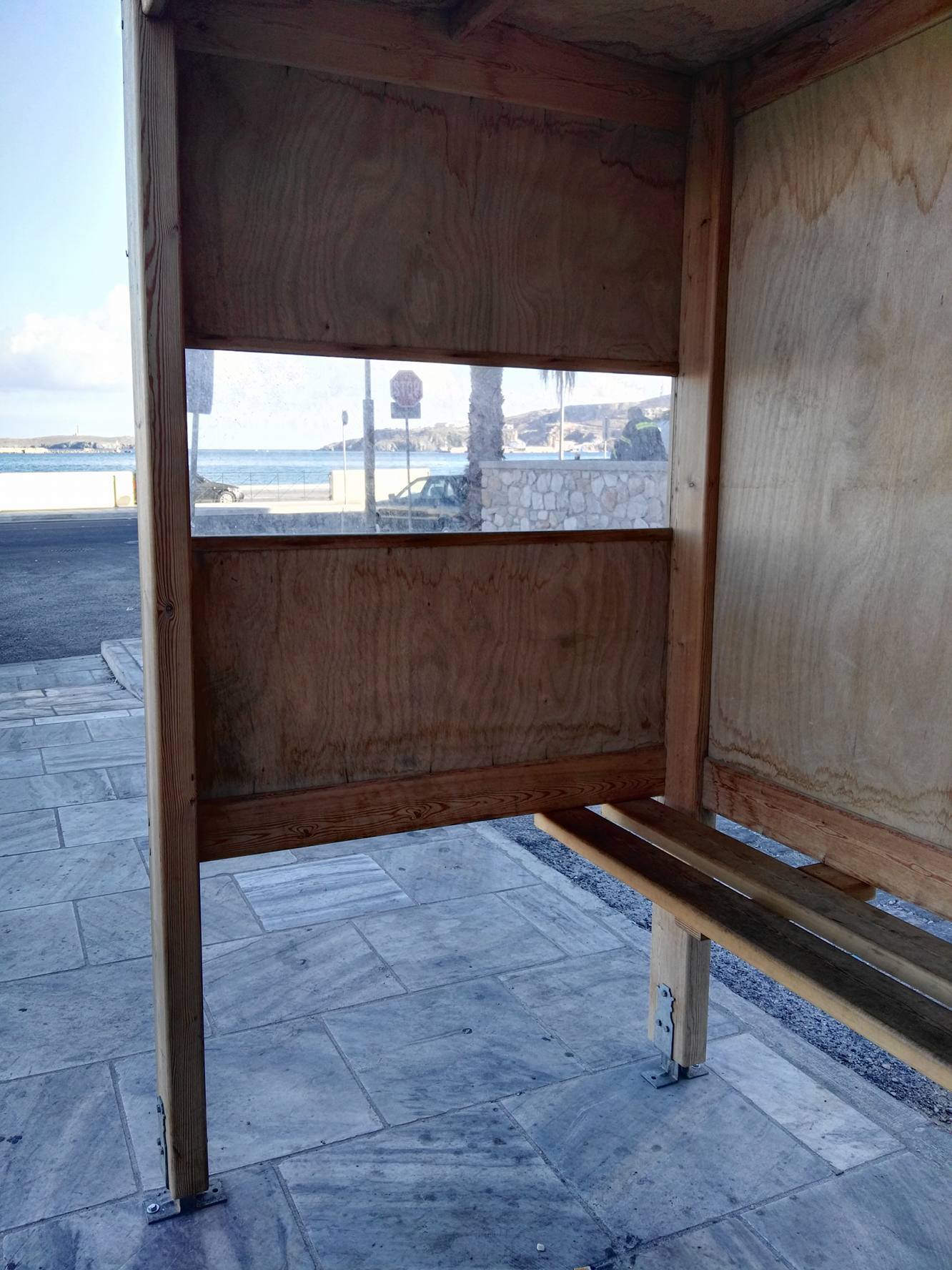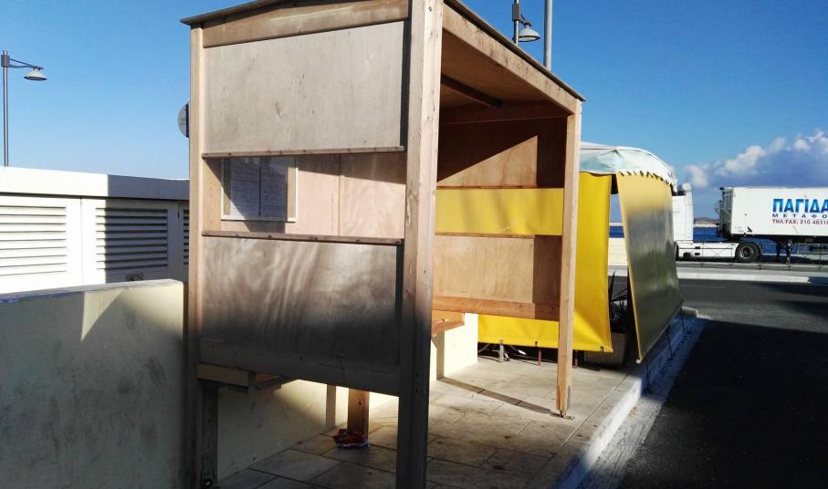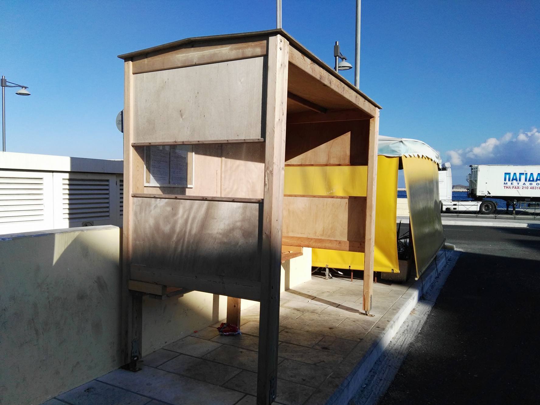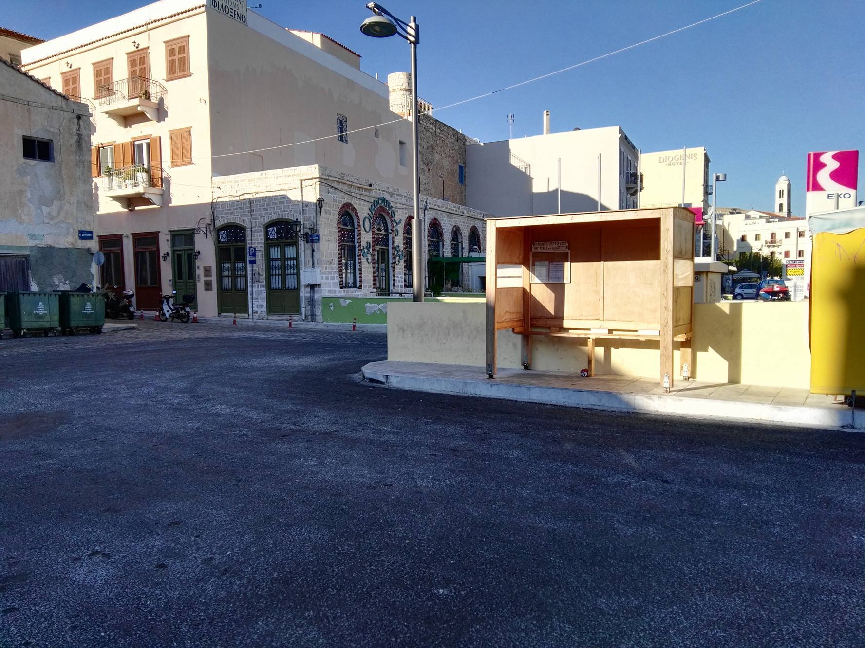 Πέραν της προχειρότητας που διακρίνεται συνολικά στη διαμόρφωσή του, όπως αυτή έχει αποτυπωθεί σε προηγούμενη αναφορά της εφημερίδας σε επίπεδο οριοθέτησης του χώρου, ρίψης ασφάλτου με ανομοιόμορφο τρόπο σε αρκετά σημεία, καθώς και κλεισίματος του μικρού τμήματος δρόμου που γειτνιάζει με αυτόν τον χώρο, μα και τοποθέτησης του συνόλου των κάδων πλησίον των σταθμευμένων λεωφορείων, την κάκιστη ποιοτικά εικόνα έρχονται να “συμπληρώσουν” οι δύο ξύλινες στάσεις λεωφορείων.