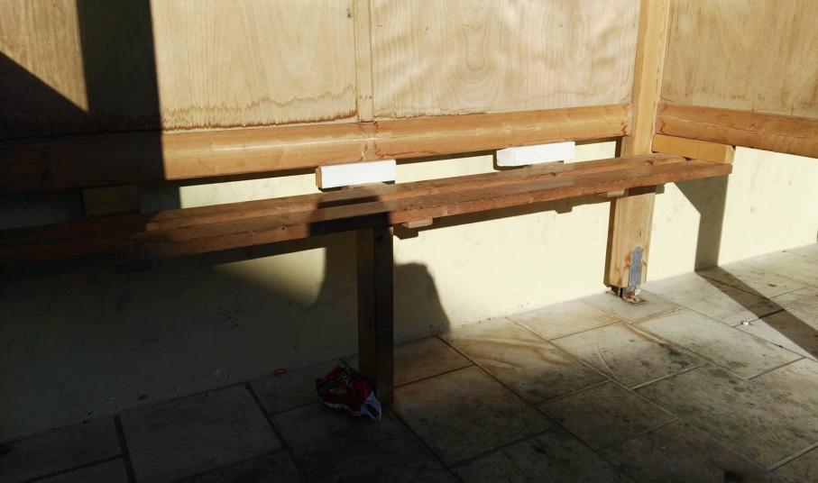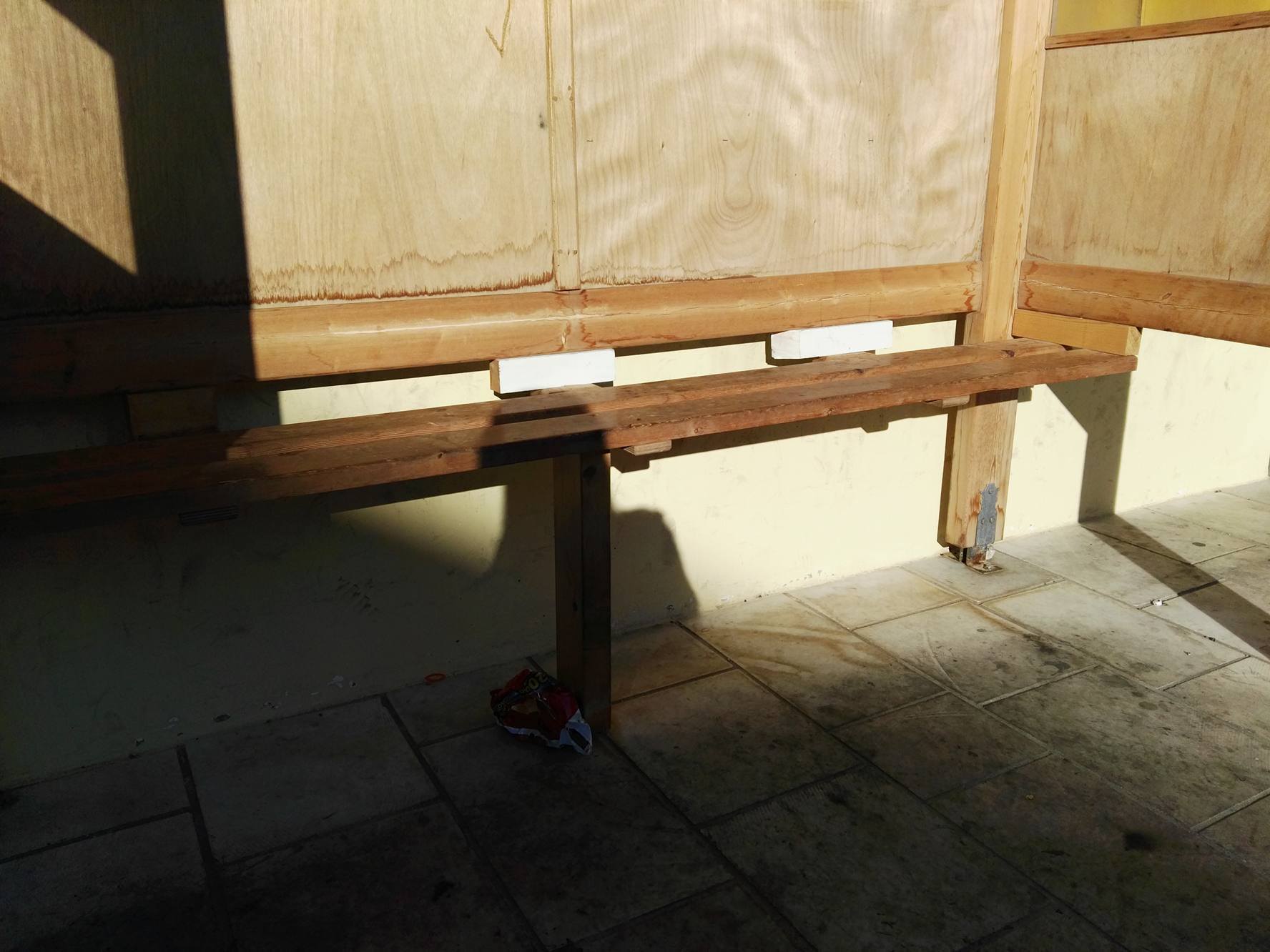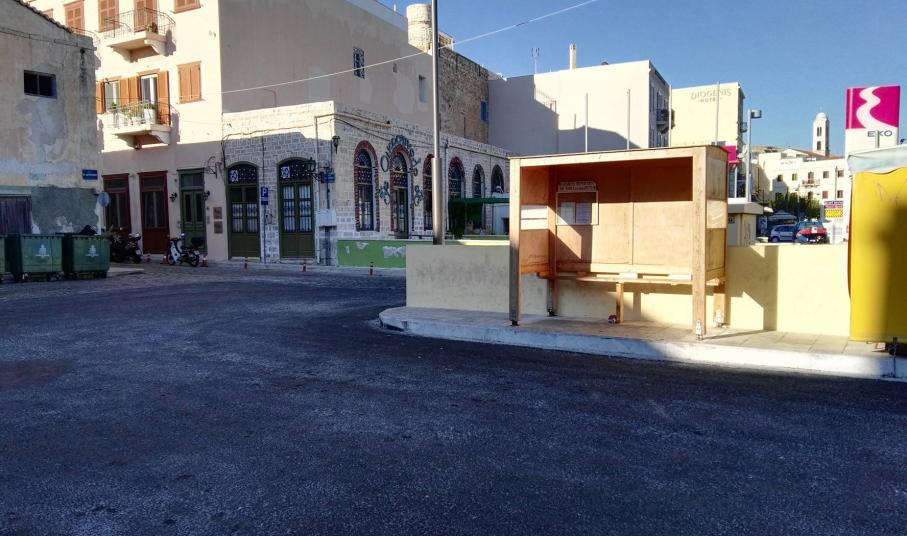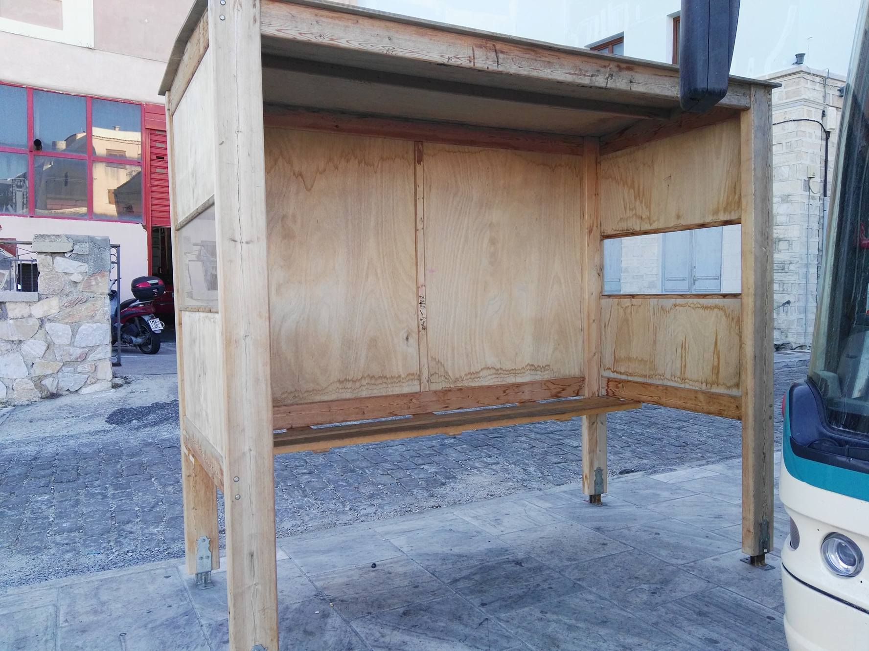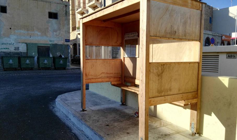 Πέραν της προχειρότητας που διακρίνεται συνολικά στη διαμόρφωσή του, όπως αυτή έχει αποτυπωθεί σε προηγούμενη αναφορά της εφημερίδας σε επίπεδο οριοθέτησης του χώρου, ρίψης ασφάλτου με ανομοιόμορφο τρόπο σε αρκετά σημεία, καθώς και κλεισίματος του μικρού τμήματος δρόμου που γειτνιάζει με αυτόν τον χώρο, μα και τοποθέτησης του συνόλου των κάδων πλησίον των σταθμευμένων λεωφορείων, την κάκιστη ποιοτικά εικόνα έρχονται να “συμπληρώσουν” οι δύο ξύλινες στάσεις λεωφορείων.
