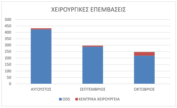 Το ίδιο διάστημα πραγματοποιήθηκαν περισσότερες από 160 εισαγωγές με μέση διάρκεια νοσηλείας τις 3 ημέρες, περισσότερες από 900 επεμβάσεις στο σηπτικό χειρουργείο (ODS) και 50 επεμβάσεις προγραμματισμένες ή έκτακτες στο κεντρικό χειρουργείο, όπου αντιμετωπίστηκαν και δύο περιστατικά εκσπλάχνωσης και εντερεκτομής.